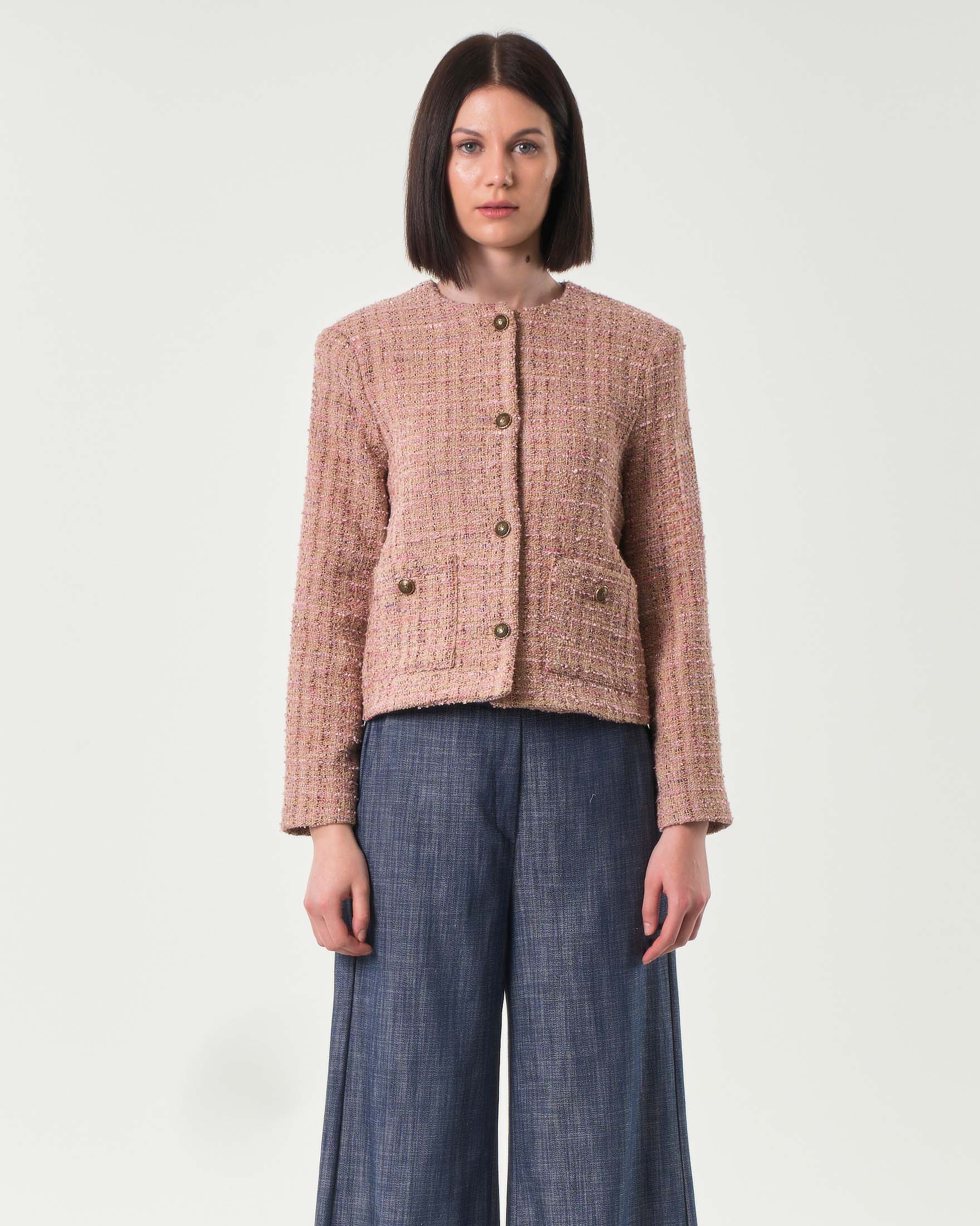 Giacca rosa e beige in stuoia di misto cotone con scollo tondo e bottoni lavorati