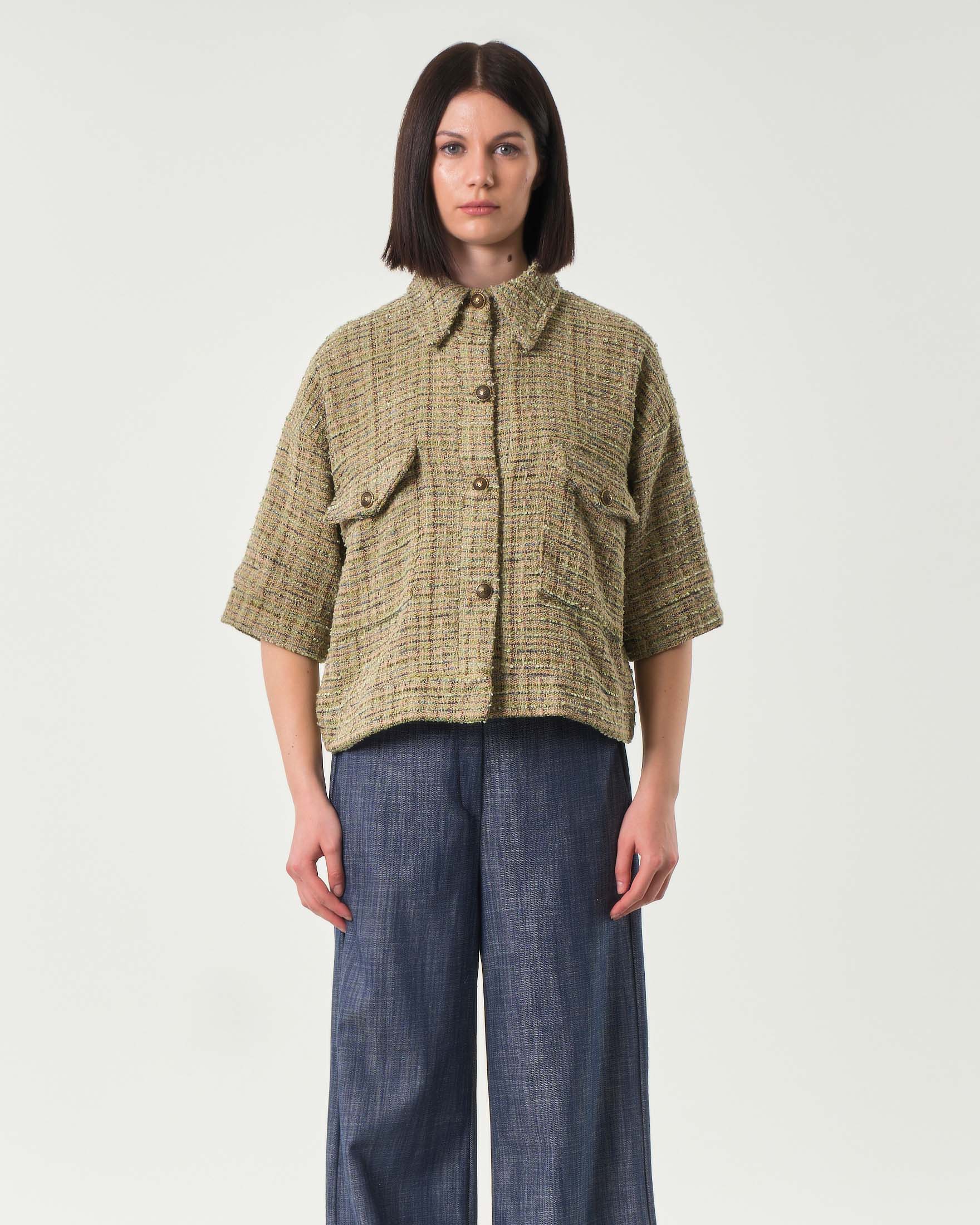Giacca over a camicia verde e beige in stuoia di misto cotone con maniche al gomito