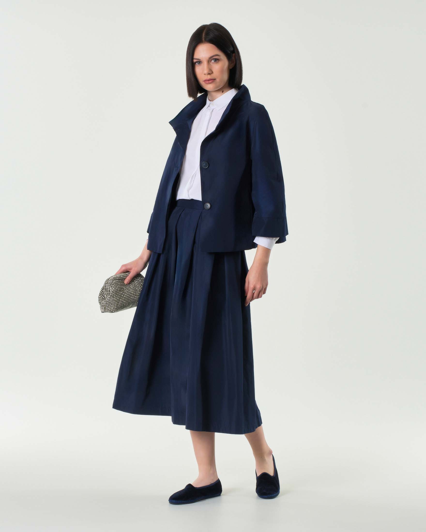 Giacca blu in taffetà con collo in piedi e maniche tre quarti