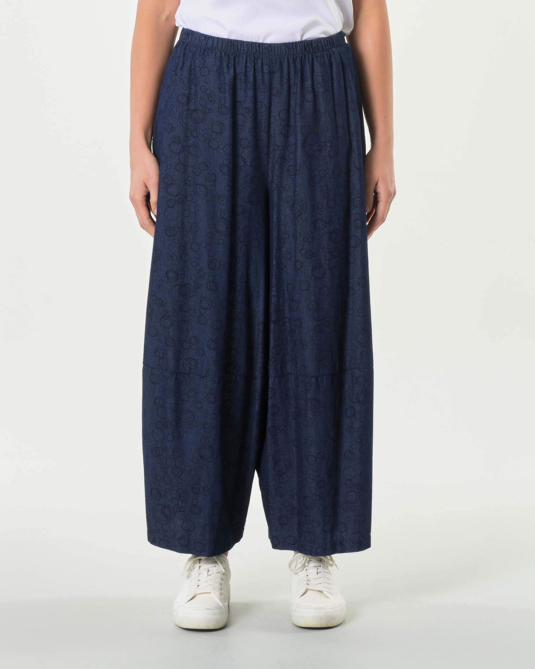 Pantaloni super wide blu in cotone chambray a fantasia bolli con elastico in vita