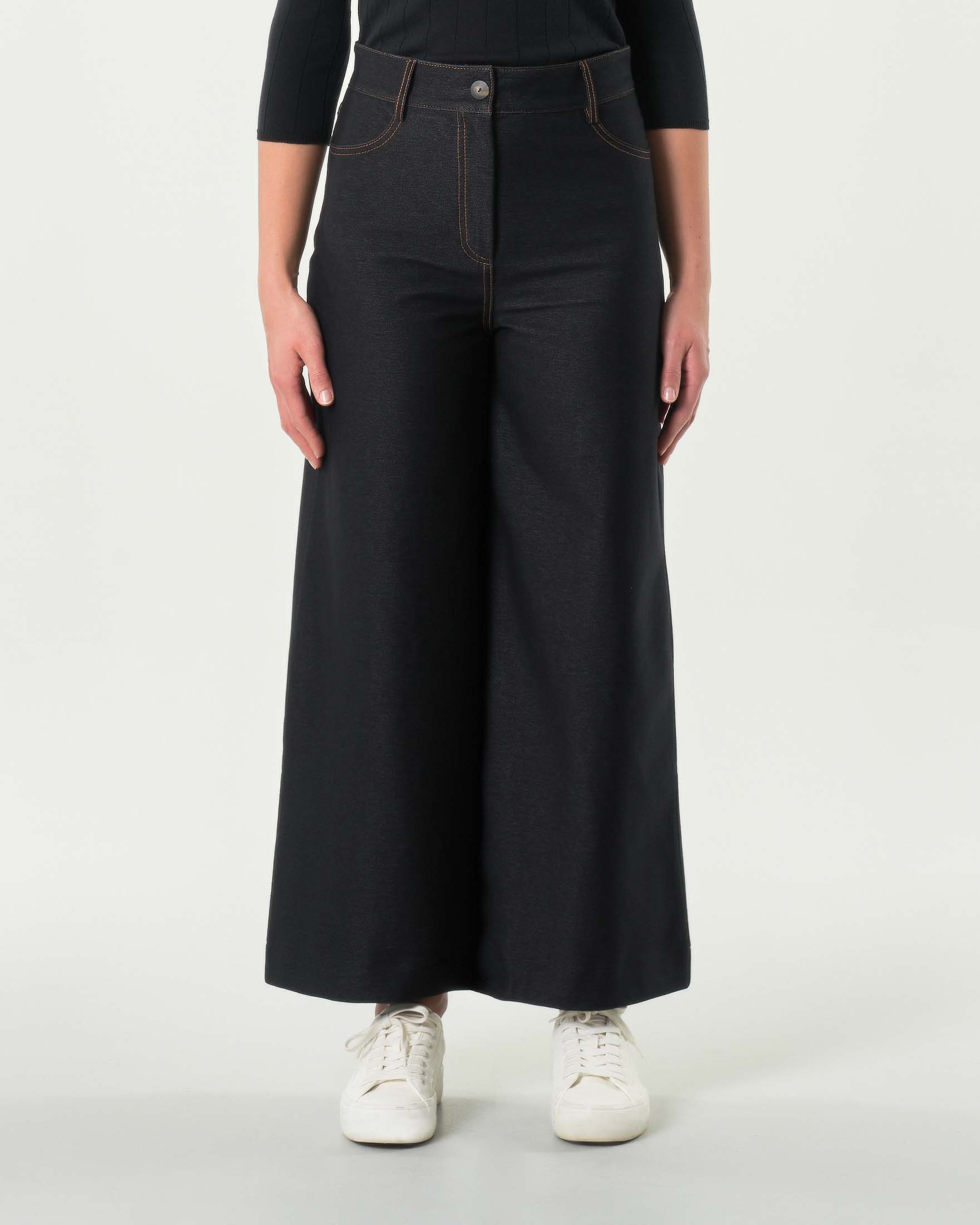 Pantaloni blu super wide in jersey effetto denim stretch con cuciture a contrasto