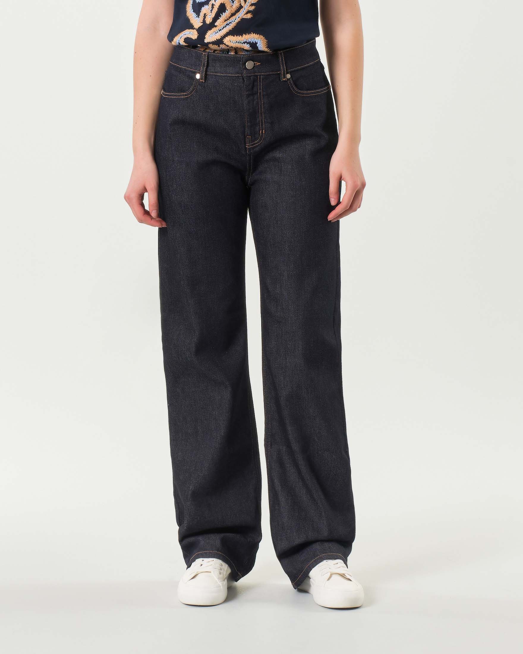 Jeans wide-leg lavaggio scuro in cotone stretch a vita alta con impunture a contrasto