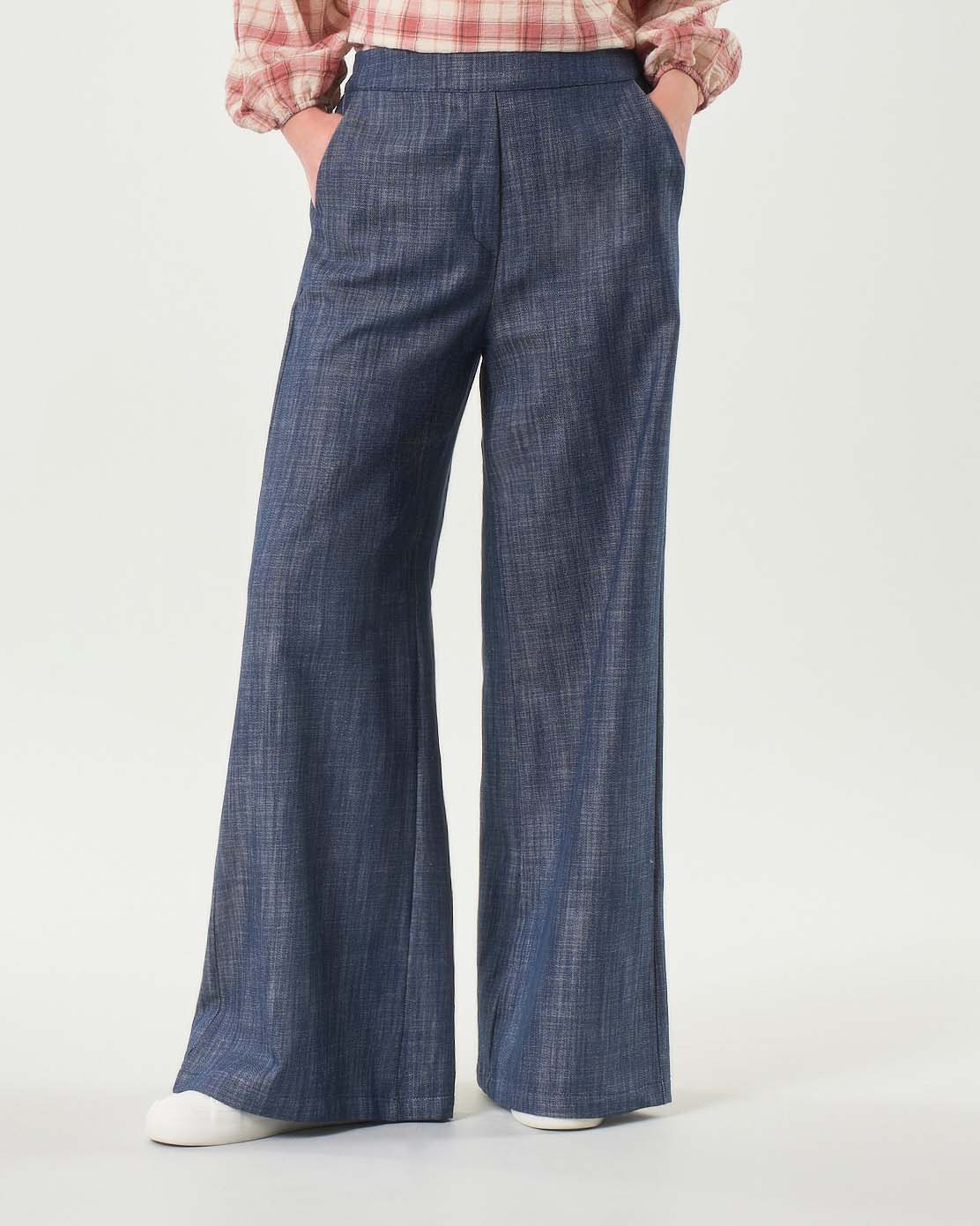 Pantaloni palazzo blu in denim di cotone con elastico inserito in vita sul retro