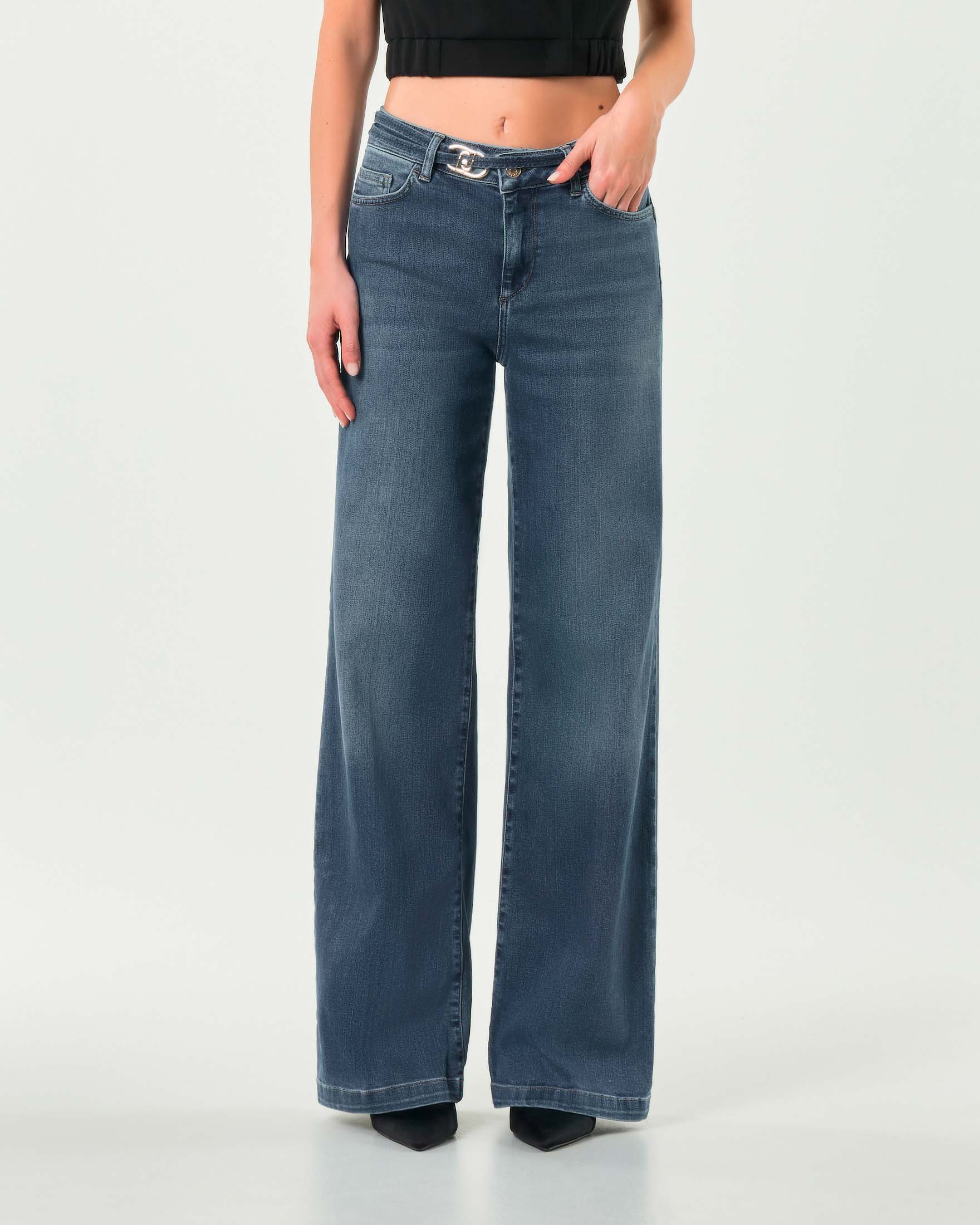 Pantaloni flare in cotone stretch Liu Jo blu stone washed con cinturina in vita con fibbia logo