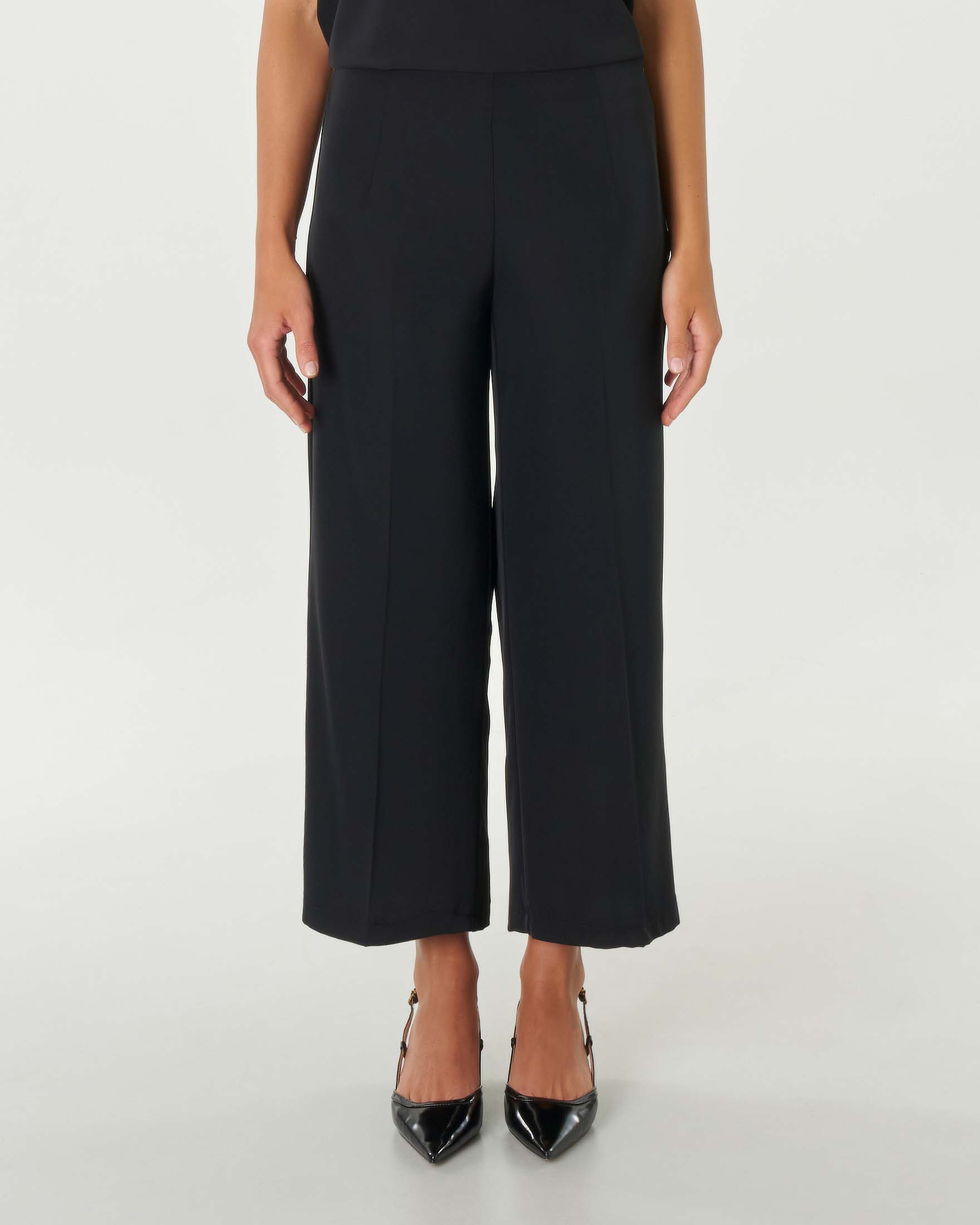 Pantaloni cropped neri in tessuto stretch fluido dalla linea ampia dritta