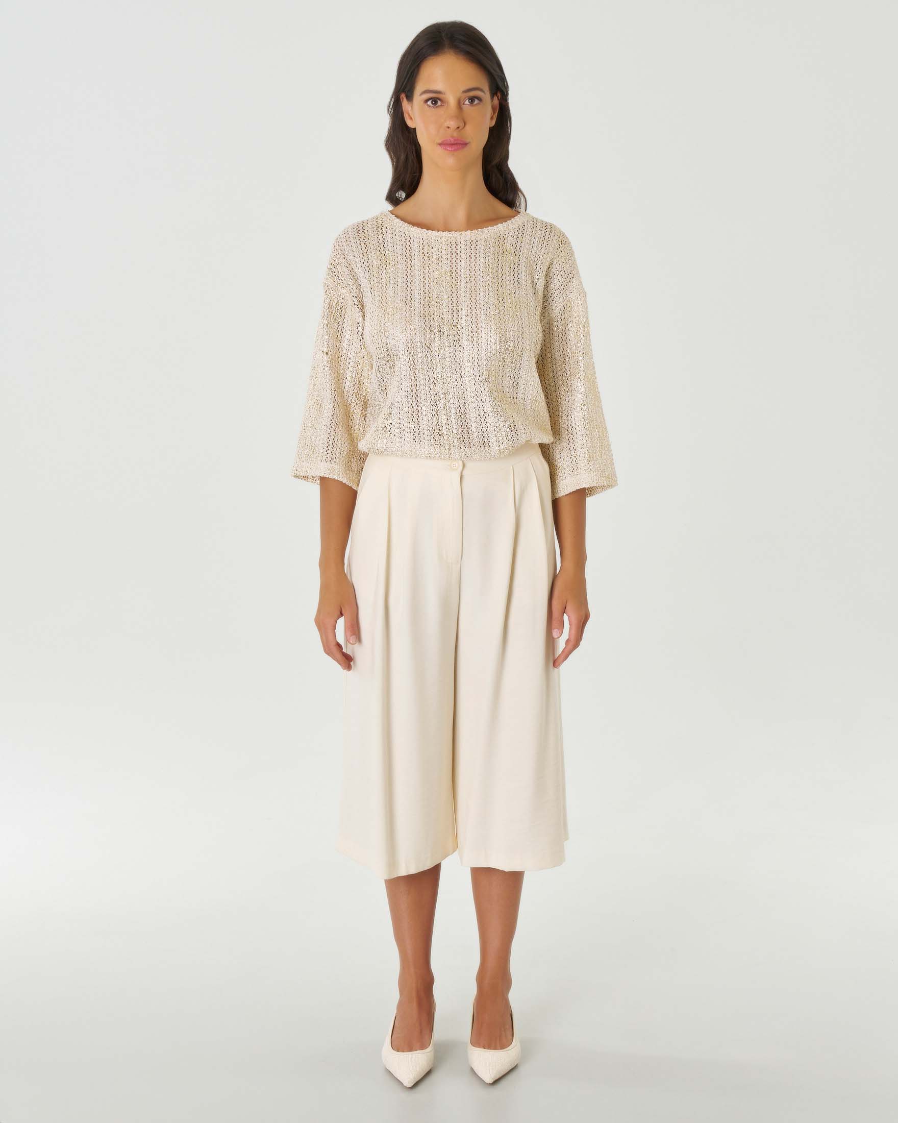 Pantaloni cropped color crema in misto viscosa con pinces in vita