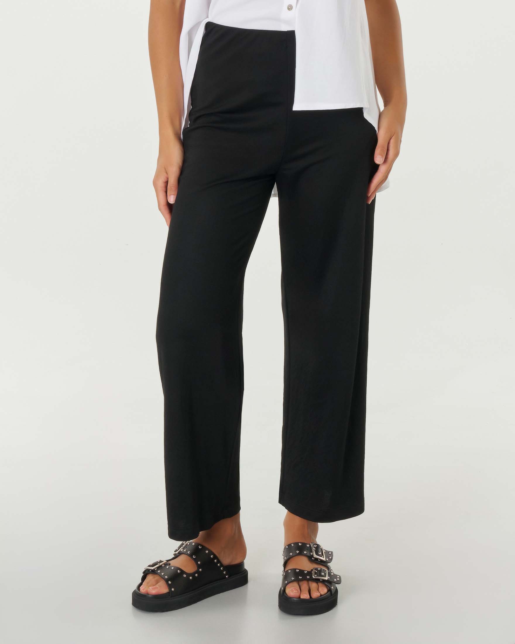 Pantaloni cropped neri dalla linea ampia e dritta in viscosa con elastico inserito in vita