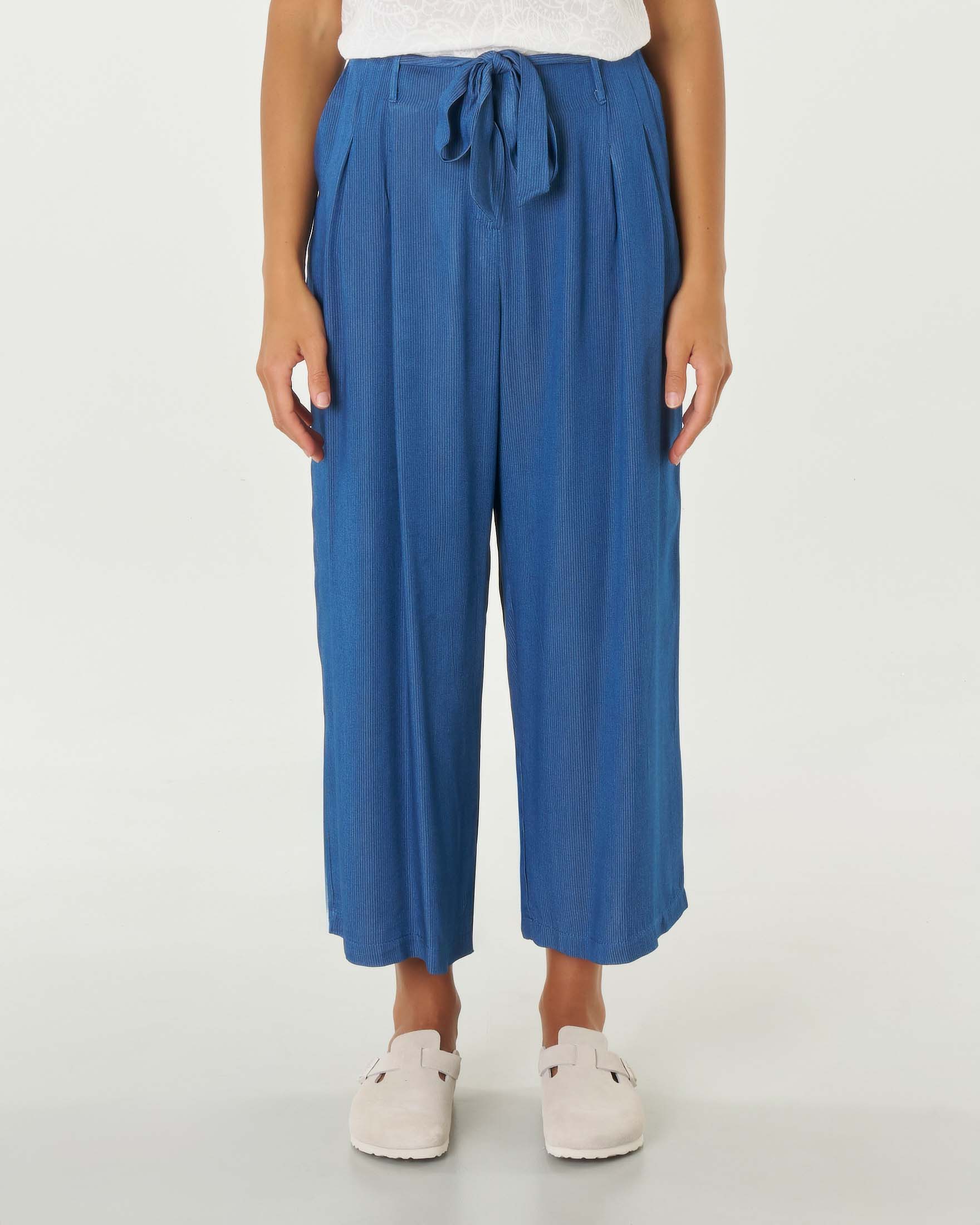 Pantaloni cropped bluette in chambray a motivo gessato con pieghe frontali e cintura annodabile