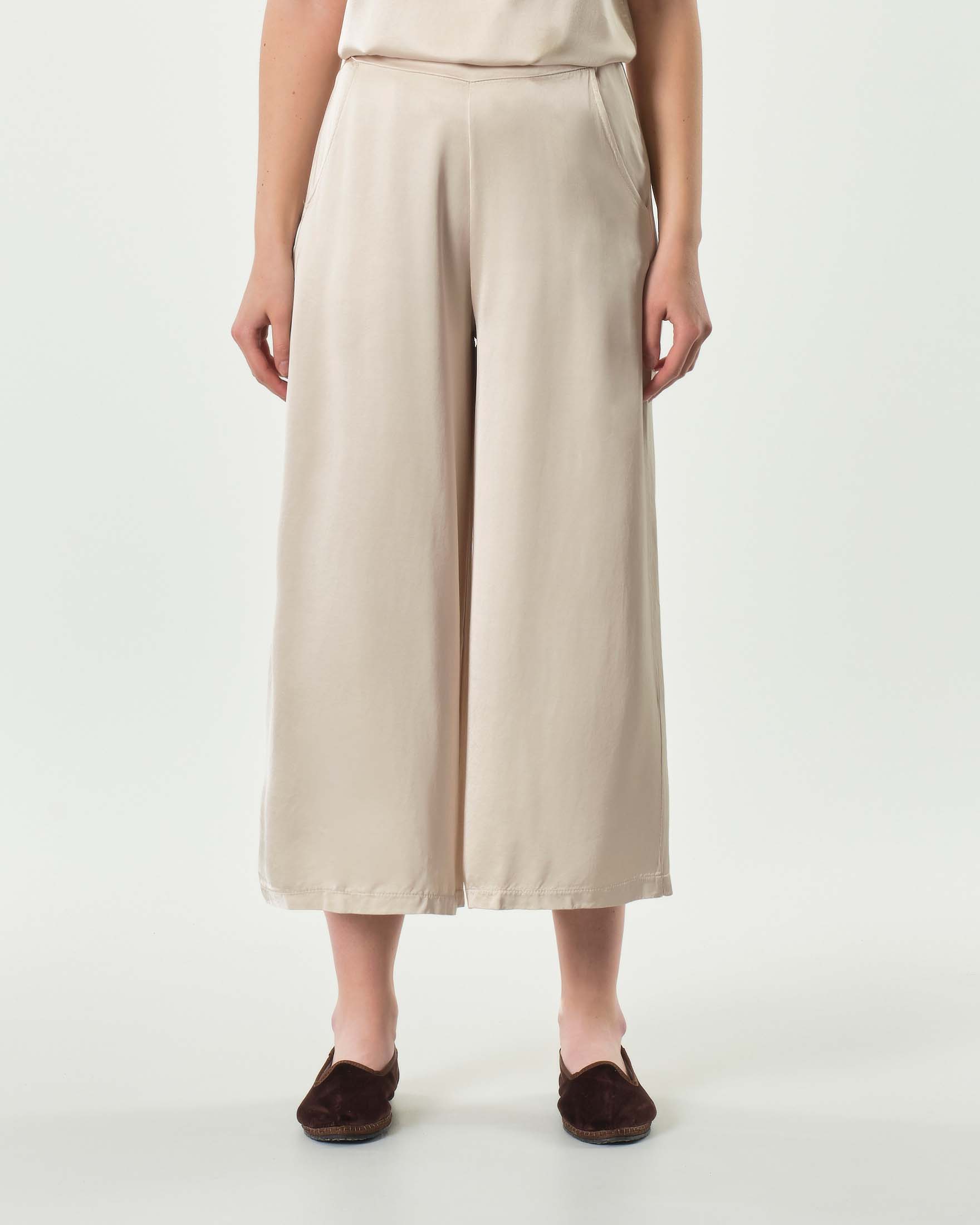 Pantaloni cropped beige in raso di viscosa e seta dalla linea ampia con elastico in vita