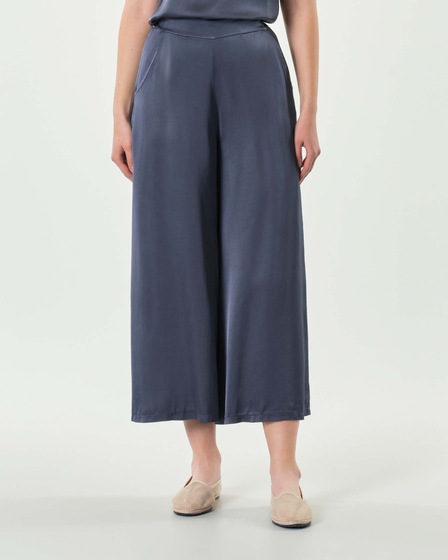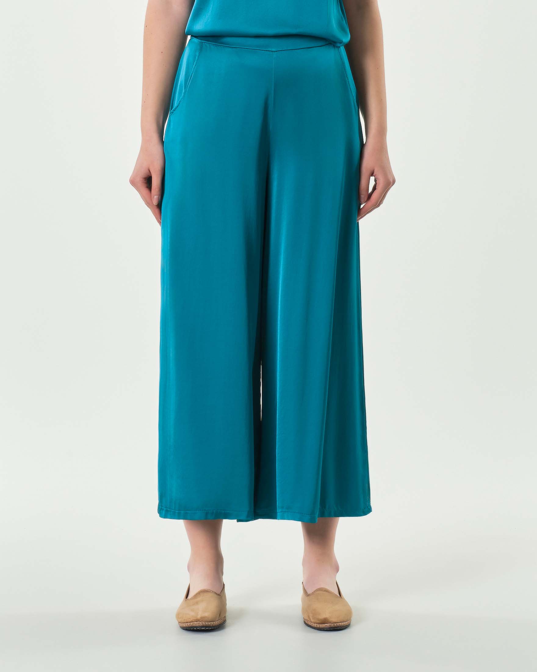 Pantaloni cropped color ottanio in raso di viscosa e seta dalla linea ampia con elastico in vita