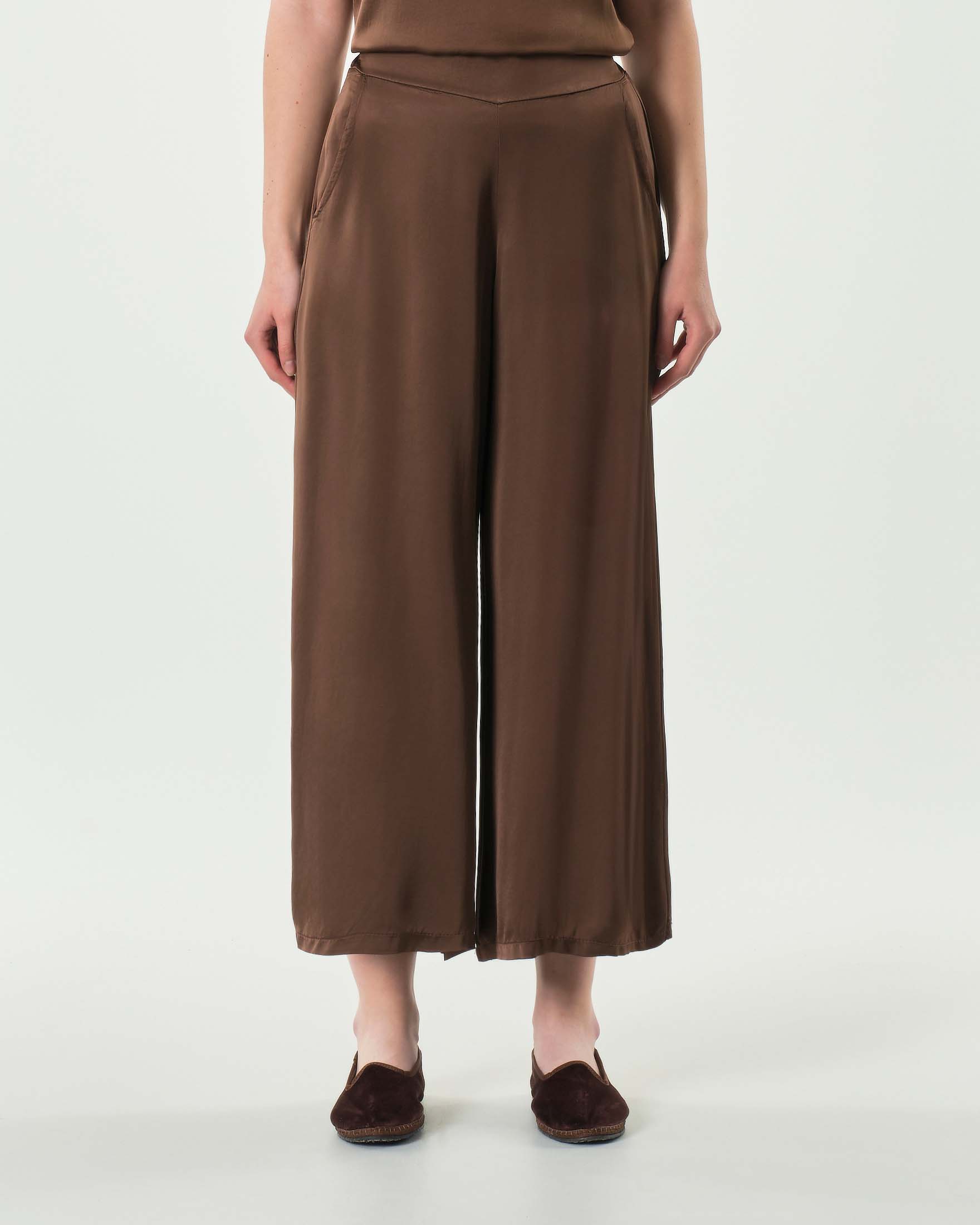 Pantaloni croppedmarroni in raso di viscosa e seta dalla linea ampia con elastico in vita