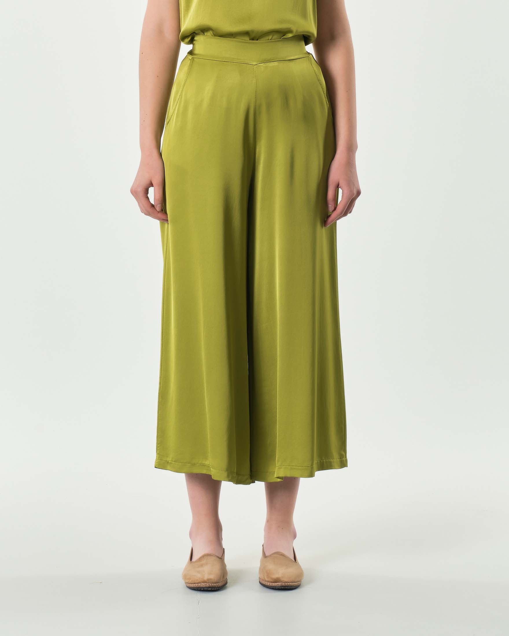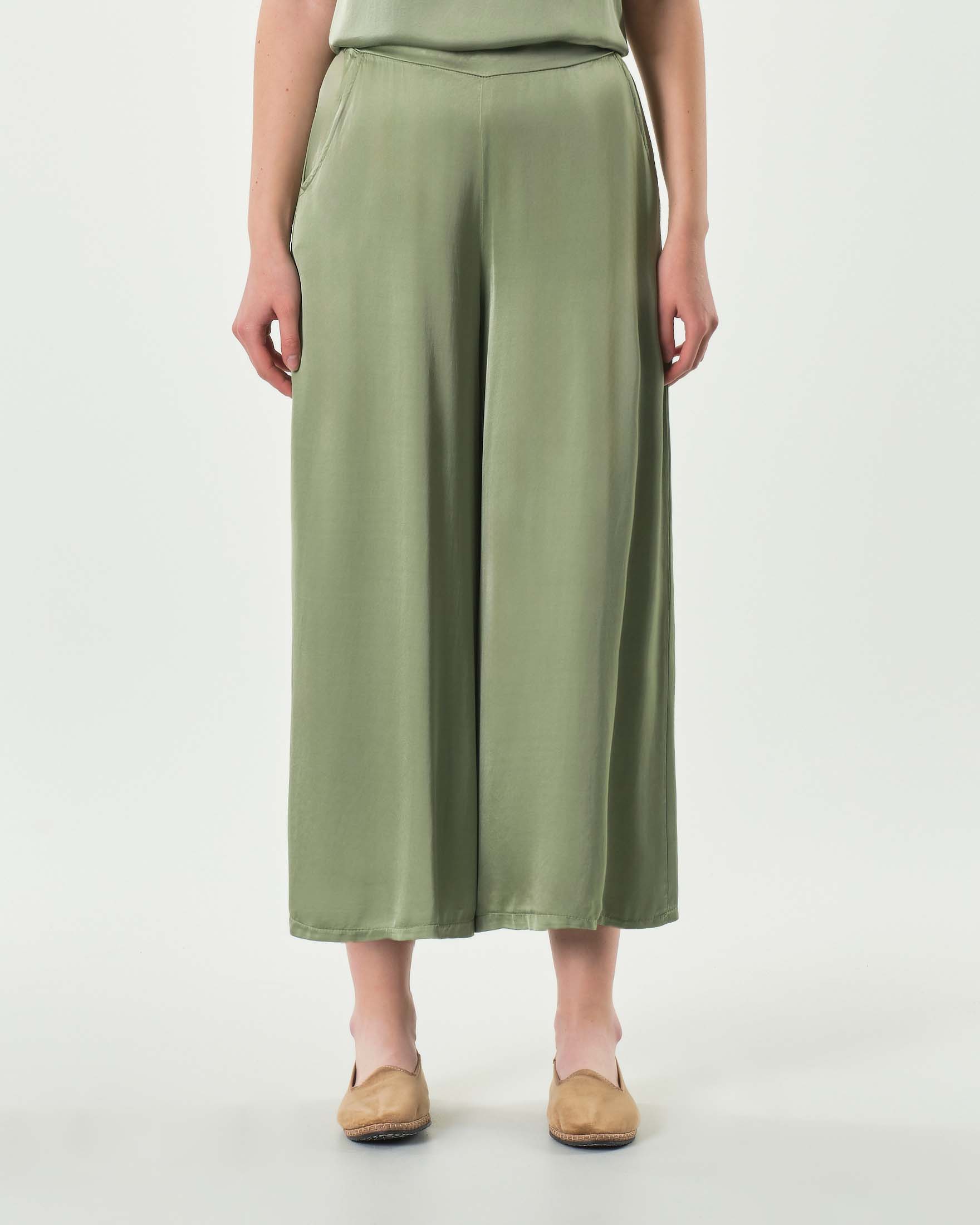 Pantaloni cropped verde militare in raso di viscosa e seta dalla linea ampia con elastico in vita