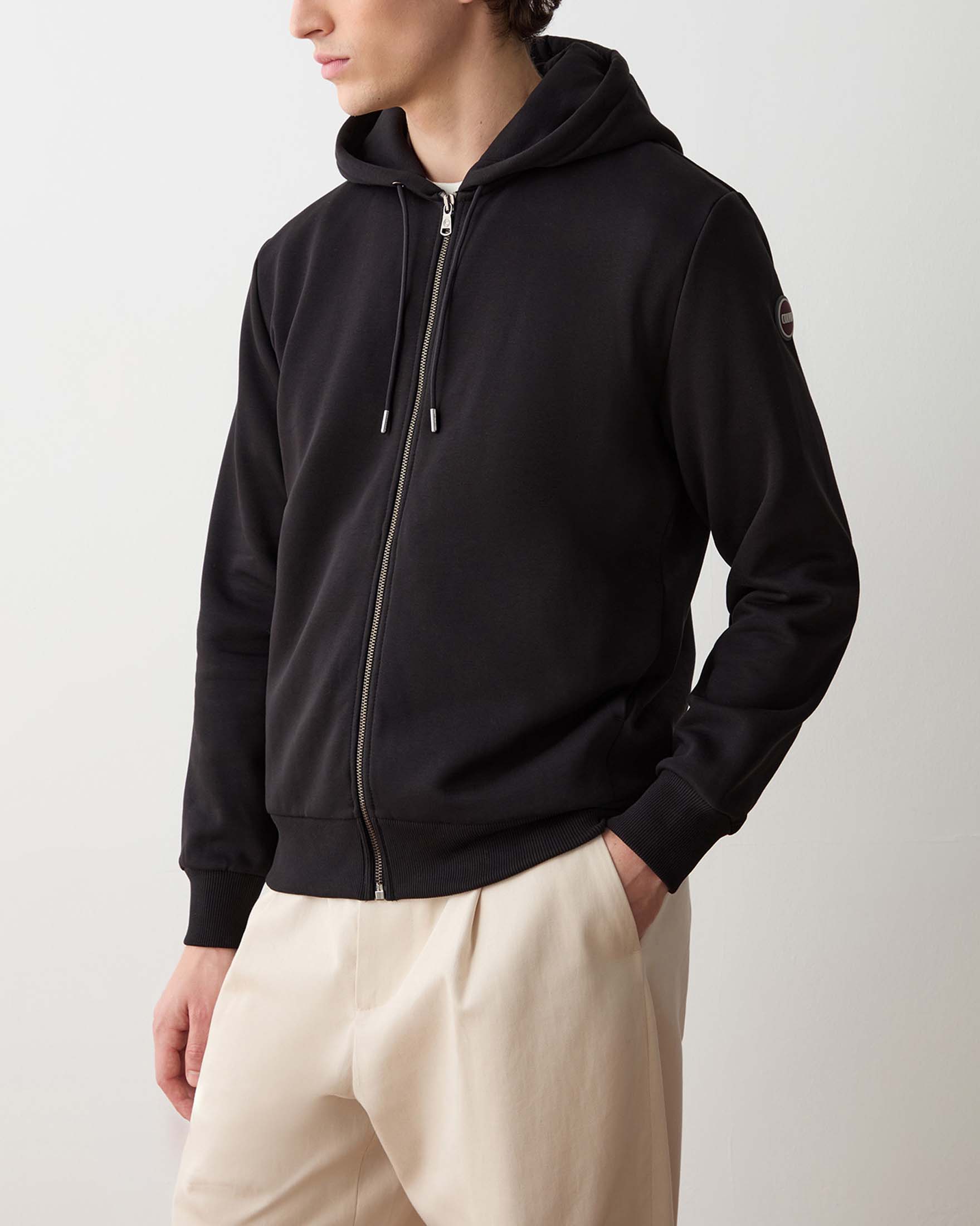 Felpa nera con cappuccio e chiusura zip con logo bollo applicato sulla manica