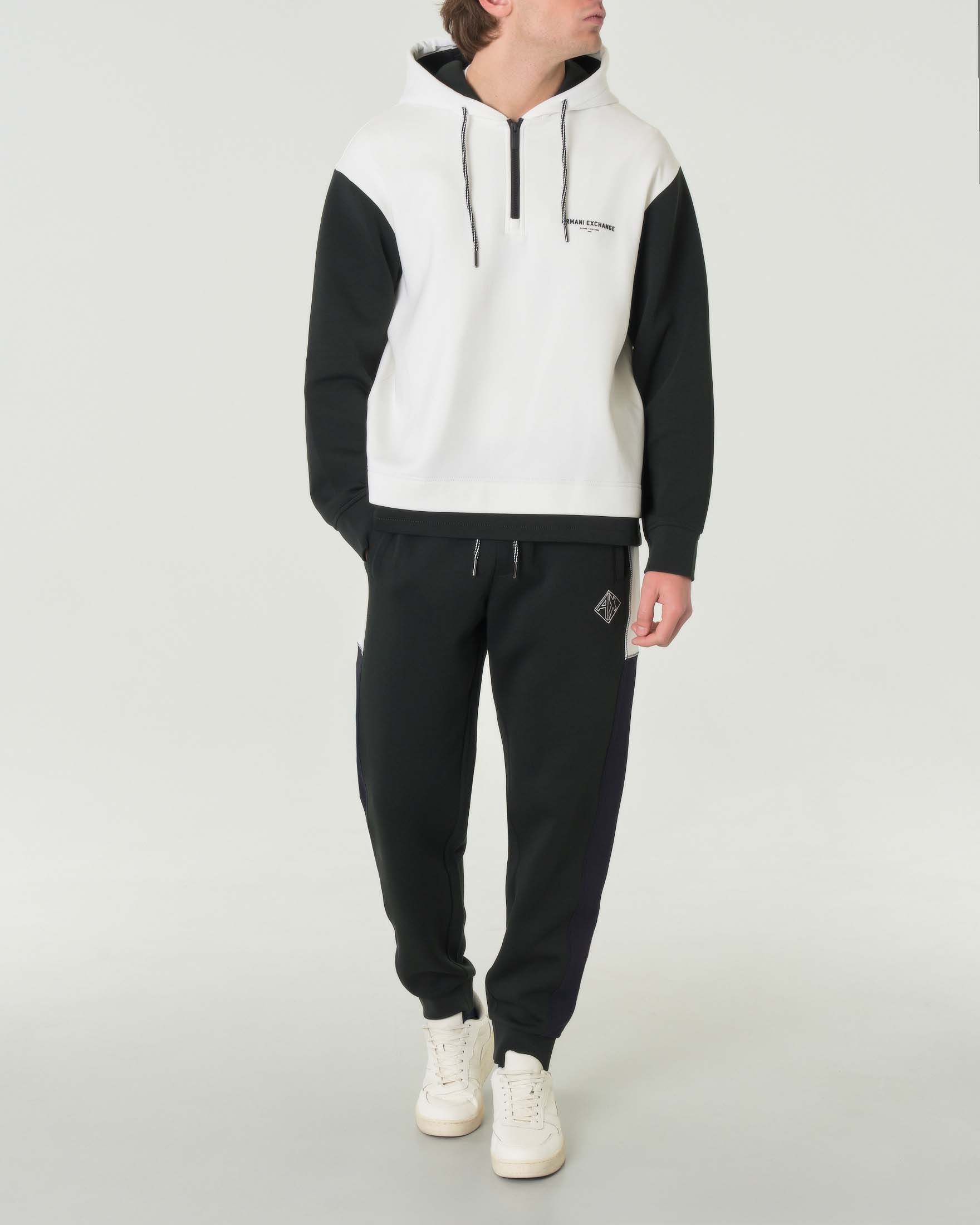 Felpa color-block bianca e verde militare con cappuccio e chiusura a mezza zip