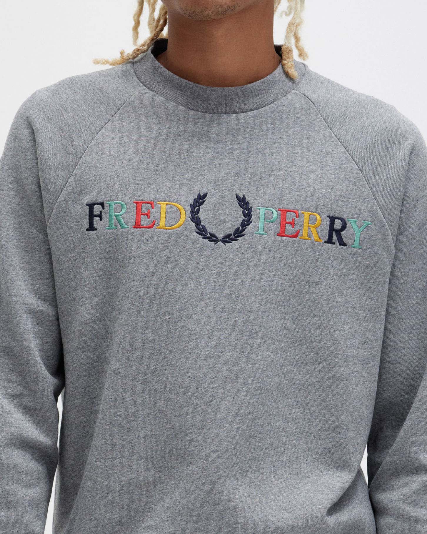 Felpa grigia girocollo con logo multicolor ricamato sul petto