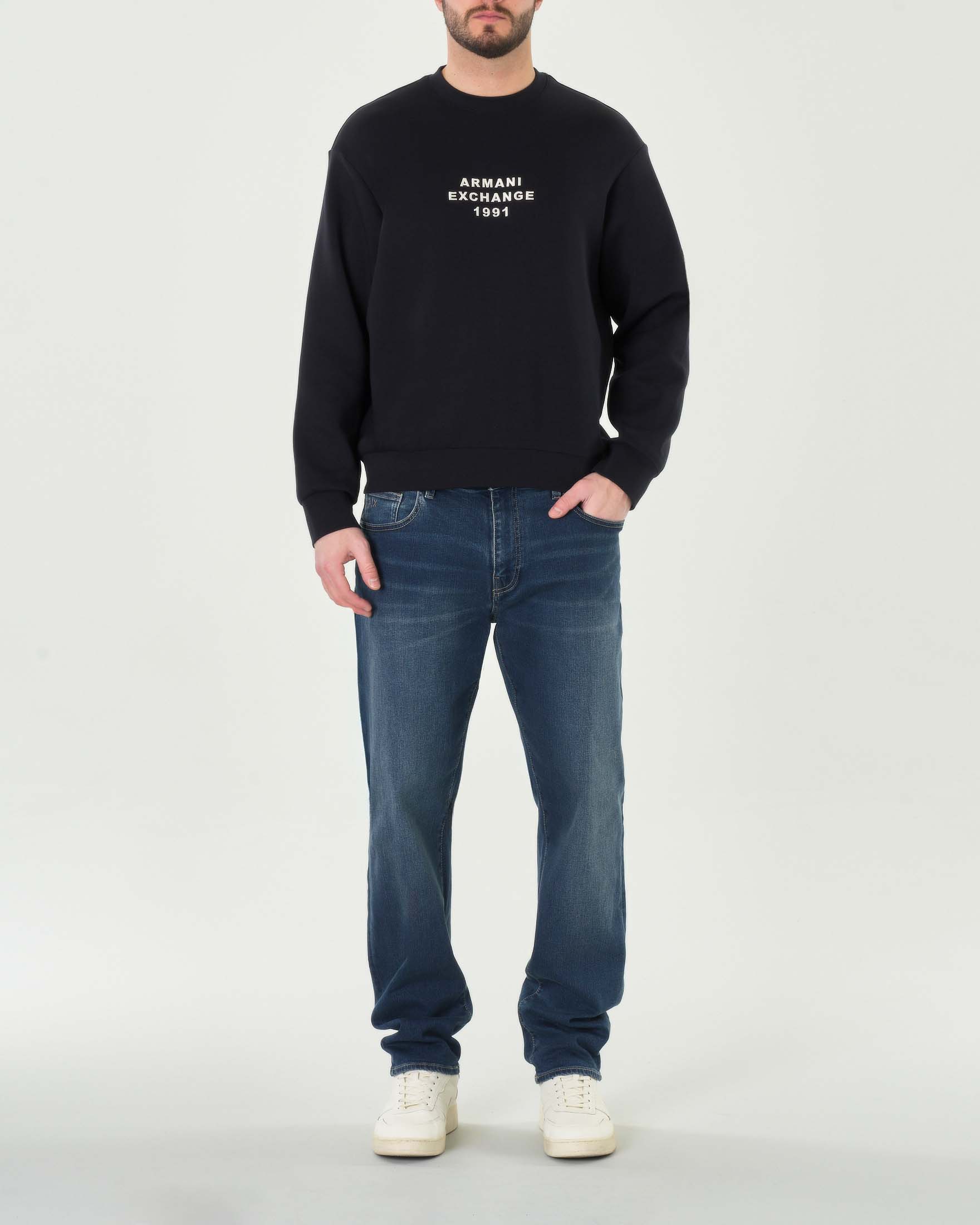 Felpa blu girocollo in interlock di cotone con logo scritta ricamato sul petto