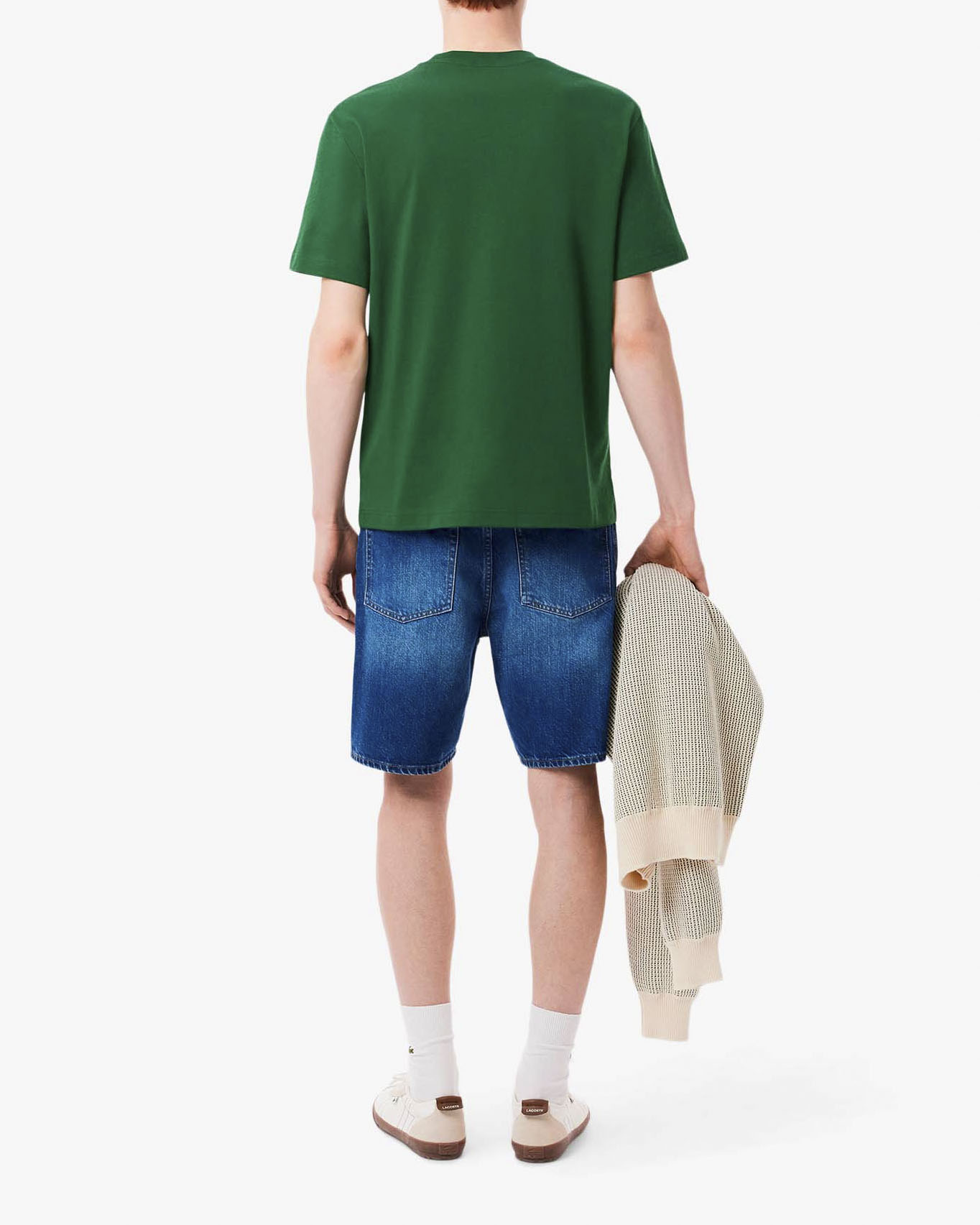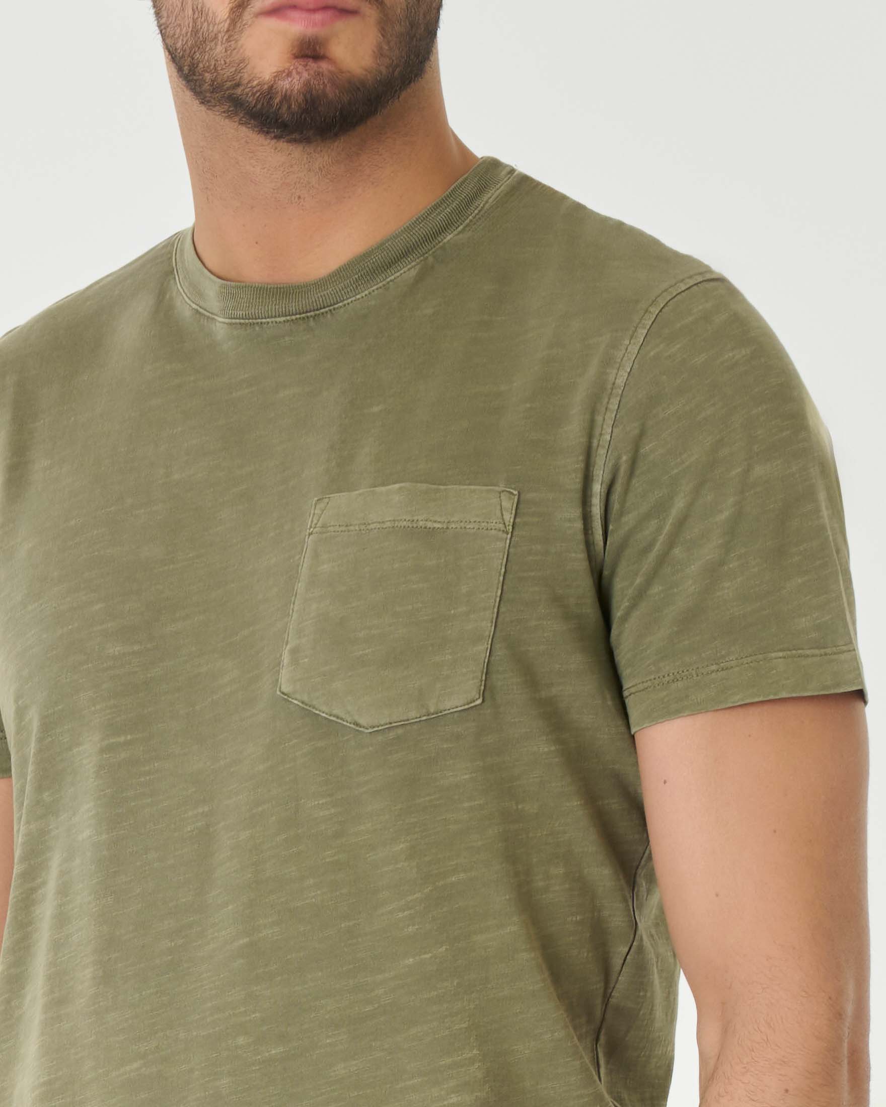 T-shirt verde militare mezza manica in cotone fiammato con taschino al petto