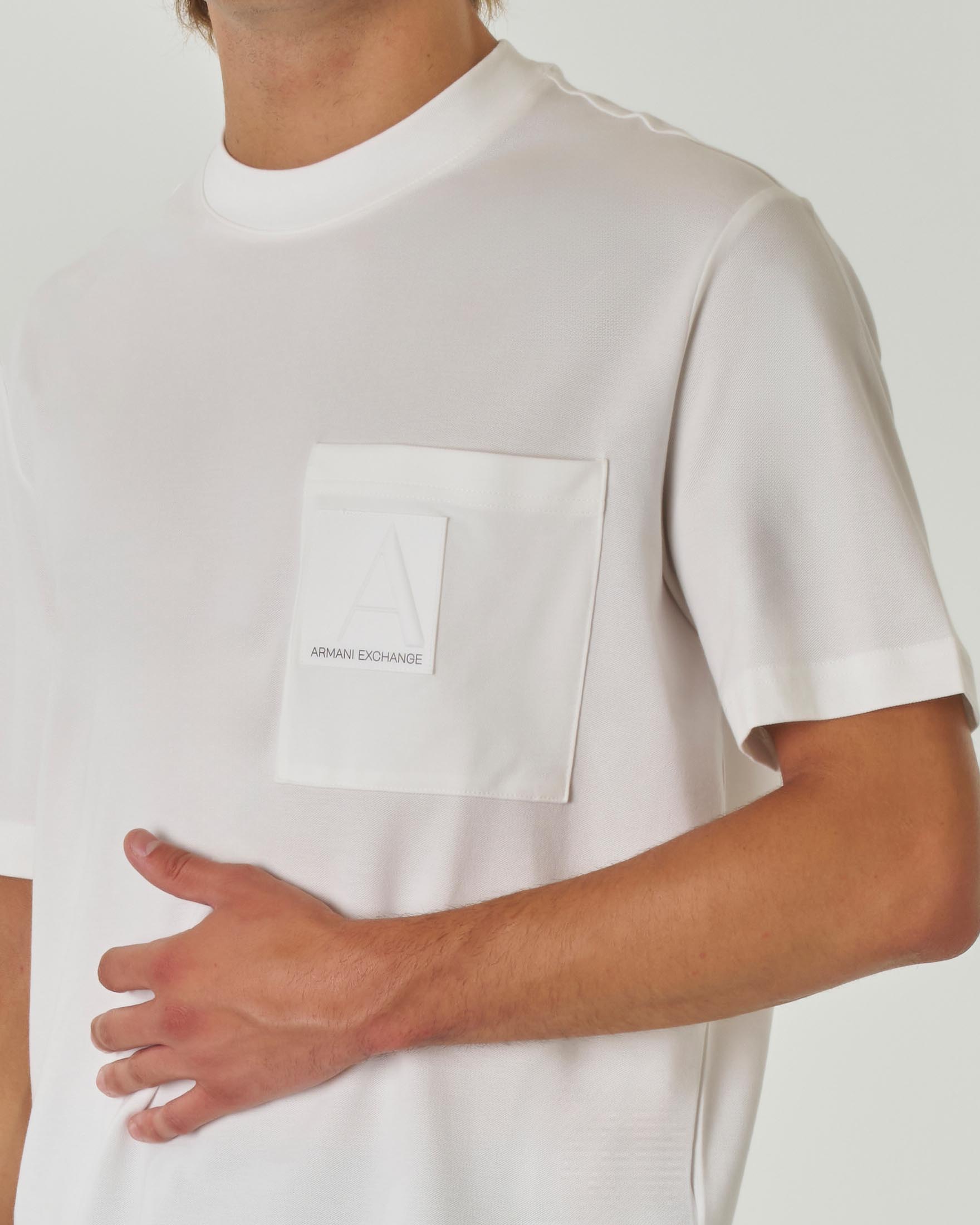 T-shirt bianca mezza manica in jersey di puro cotone con taschino applicato sul petto e scollo tagli...