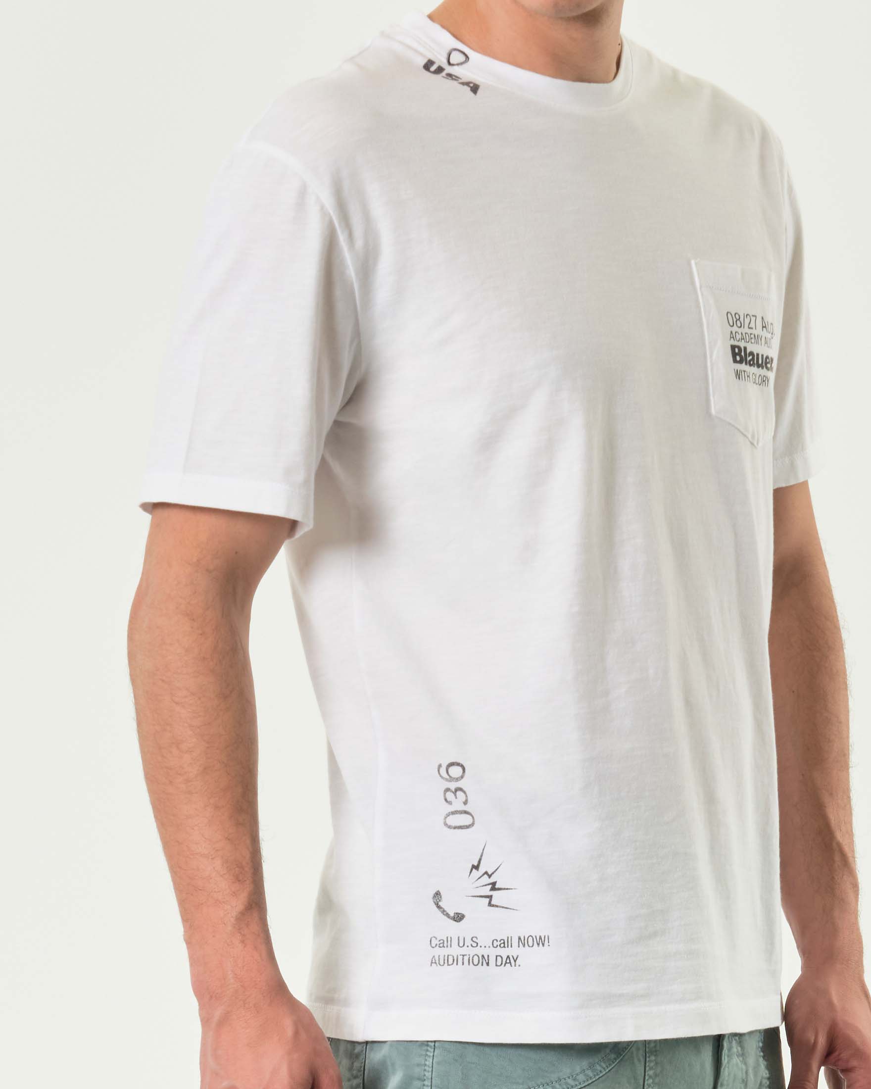 T-shirt Blauer bianca in cotone fiammato con taschino e scritte
