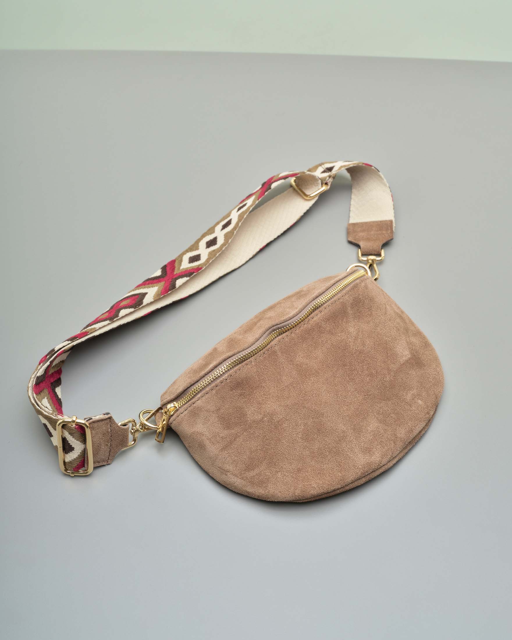 Marsupio in suede color taupe con tracolla abbinata e in tessuto intrecciato a motivo navajo