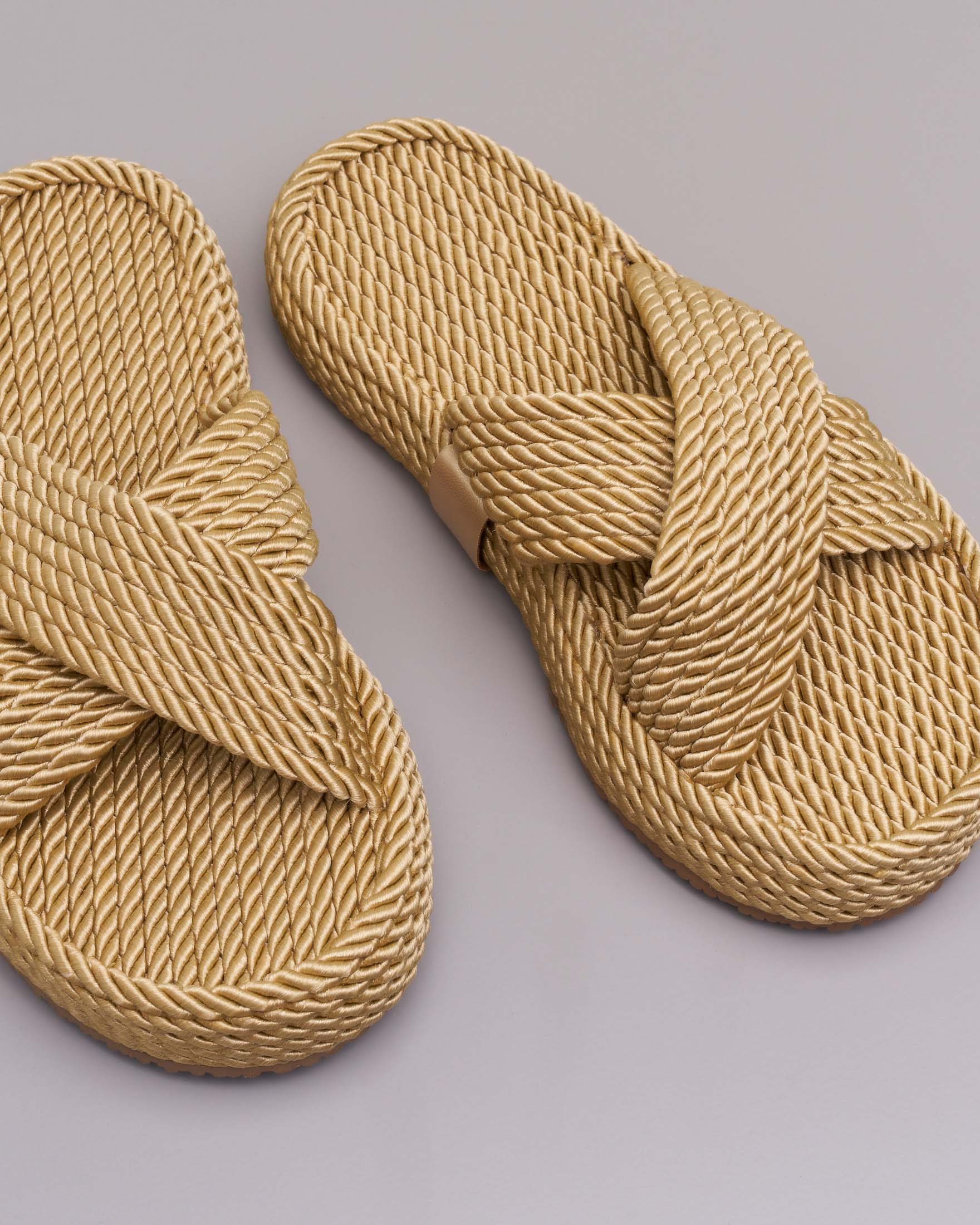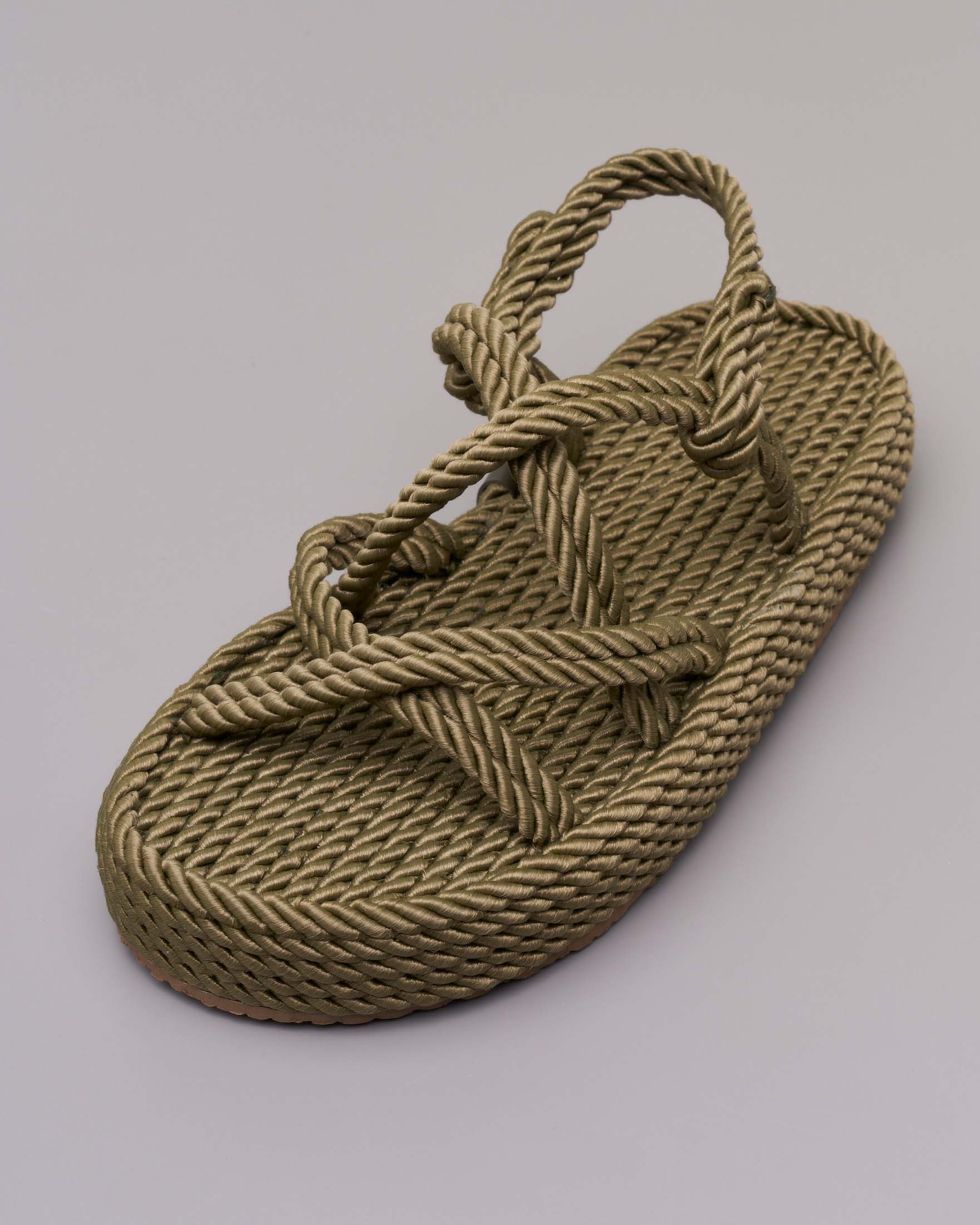 Sandali color khaki in corda intrecciata con suola alta e doppie fascette incrociate