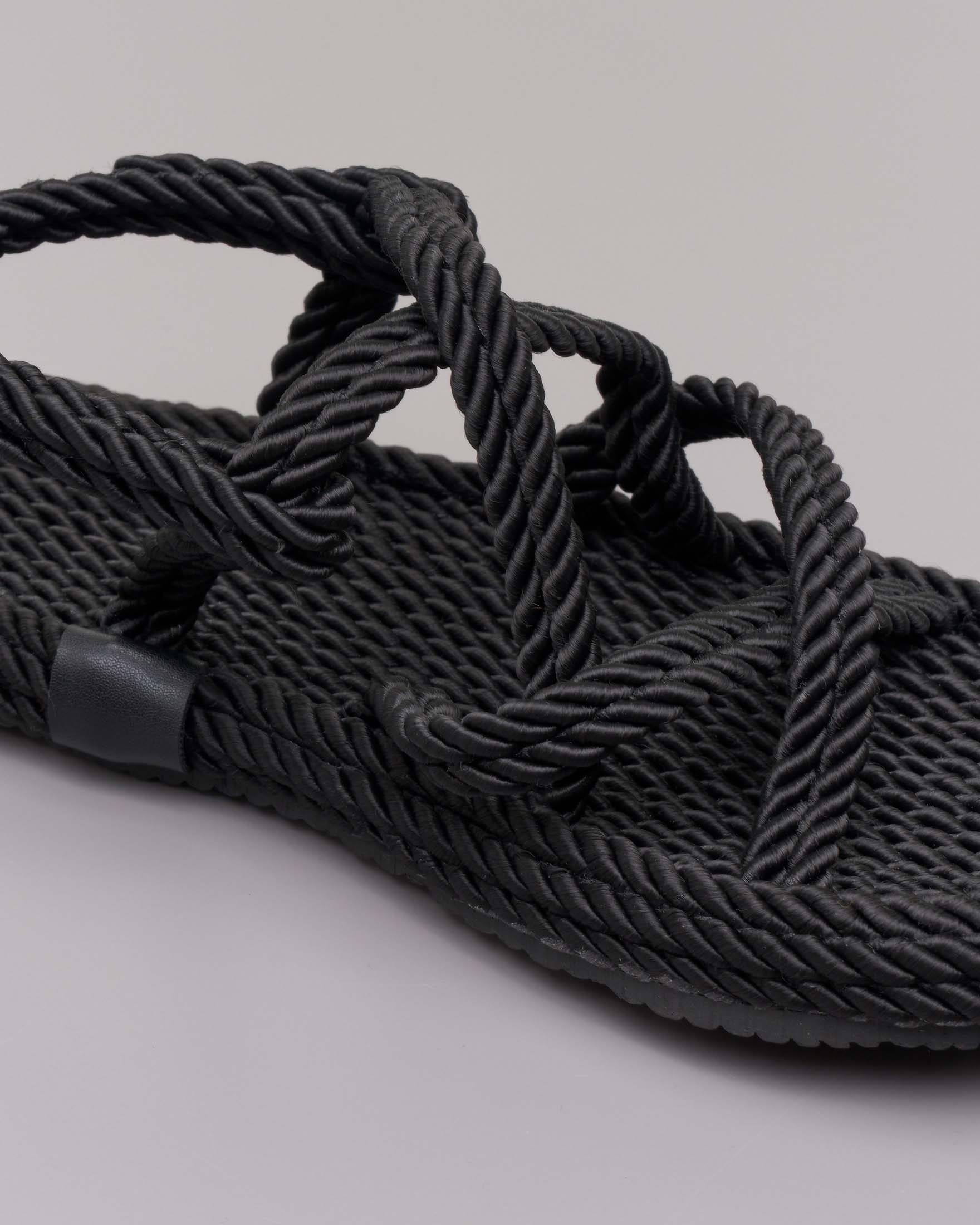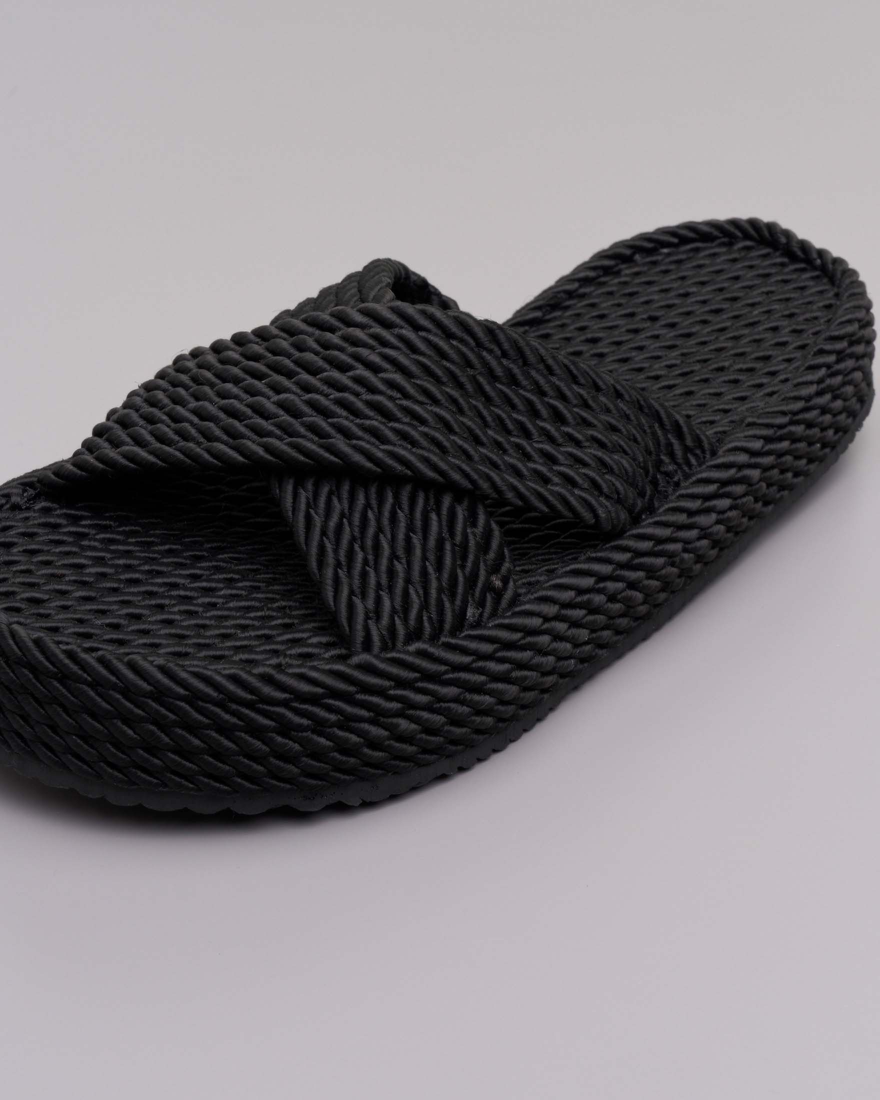 Sandali bassi neri in corda intrecciata con doppie fascette incrociate