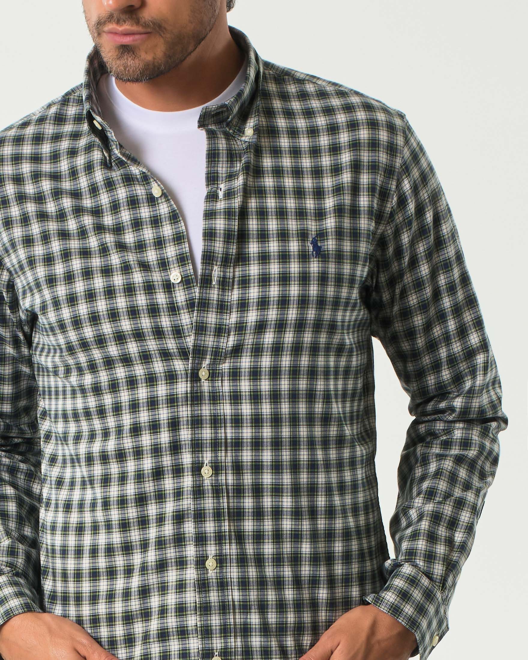 Camicia Polo Ralph Lauren custom-fit in puro cotone a fantasia check blu e verde con colletto button...