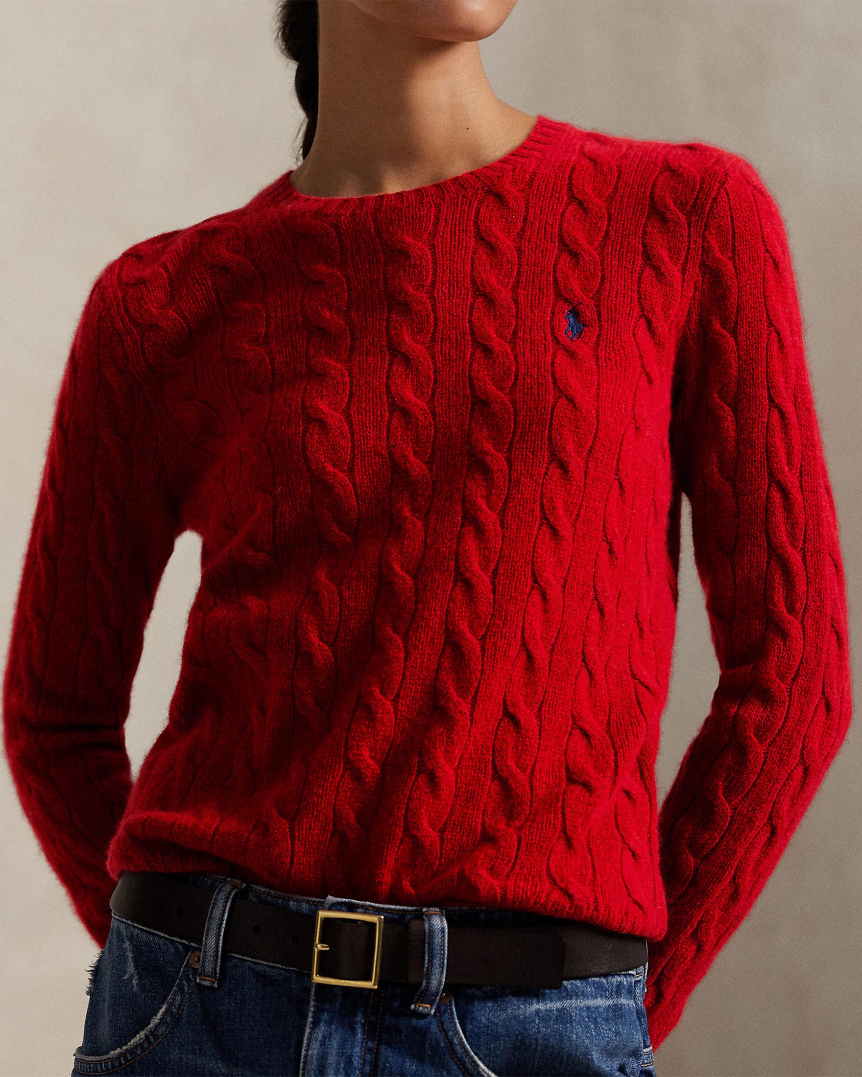 Maglioncino rosso scuro Polo Ralph Lauren in lana e cashmere a trecce con scollo a giro e logo ricam...