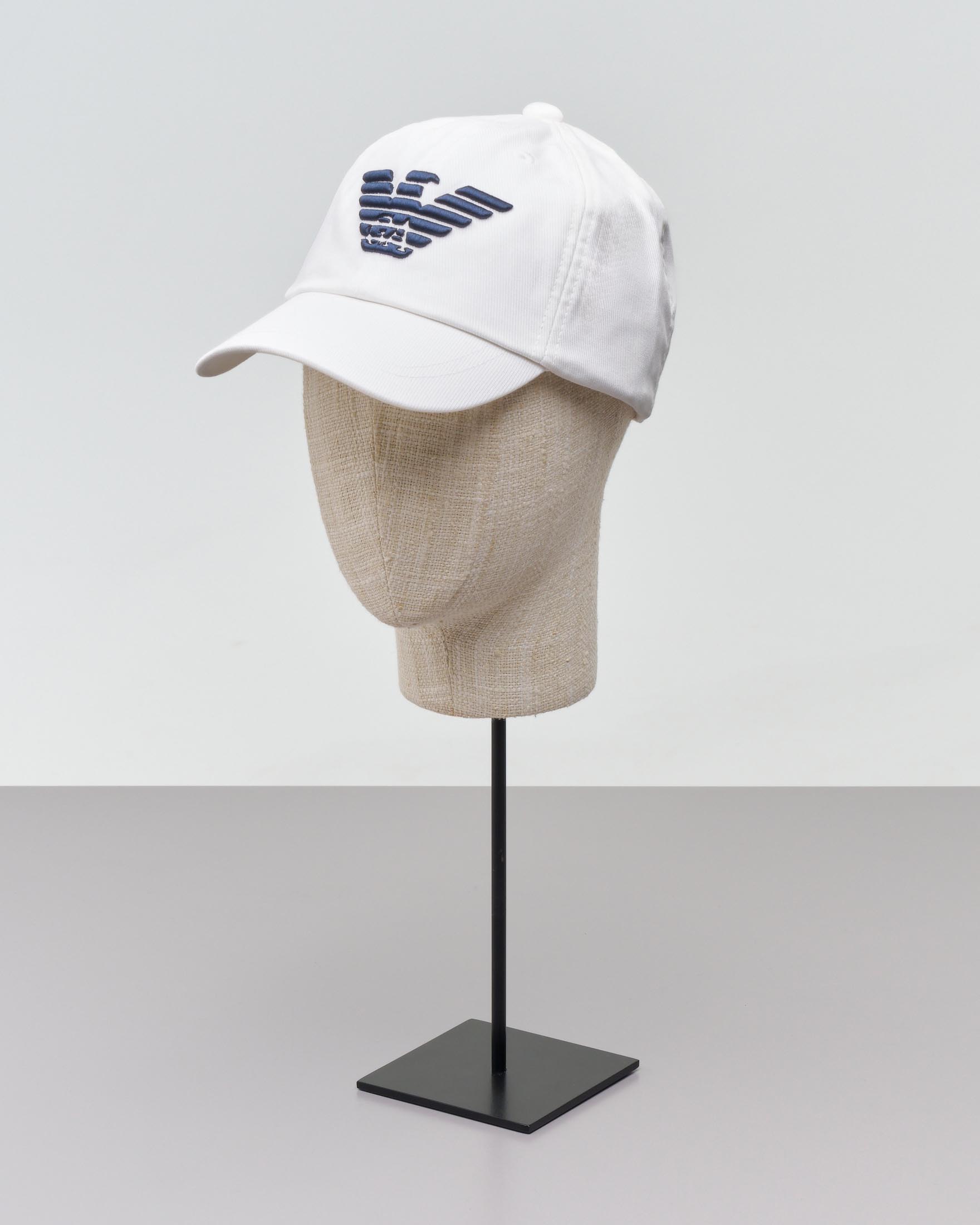 Berretto bianco Emporio Armani Junior in cotone con frontino e logo aquila blu in rilievo davanti