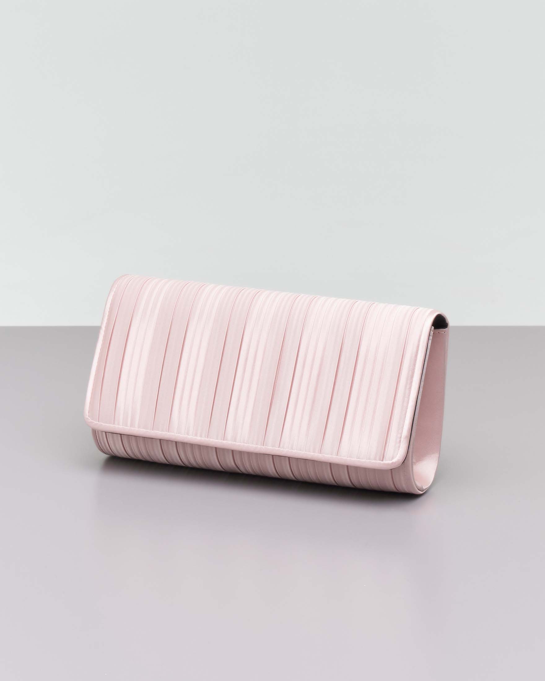 Pochette a busta rosa cipria in raso plissè con patta di chiusura e tracolla catena dorata