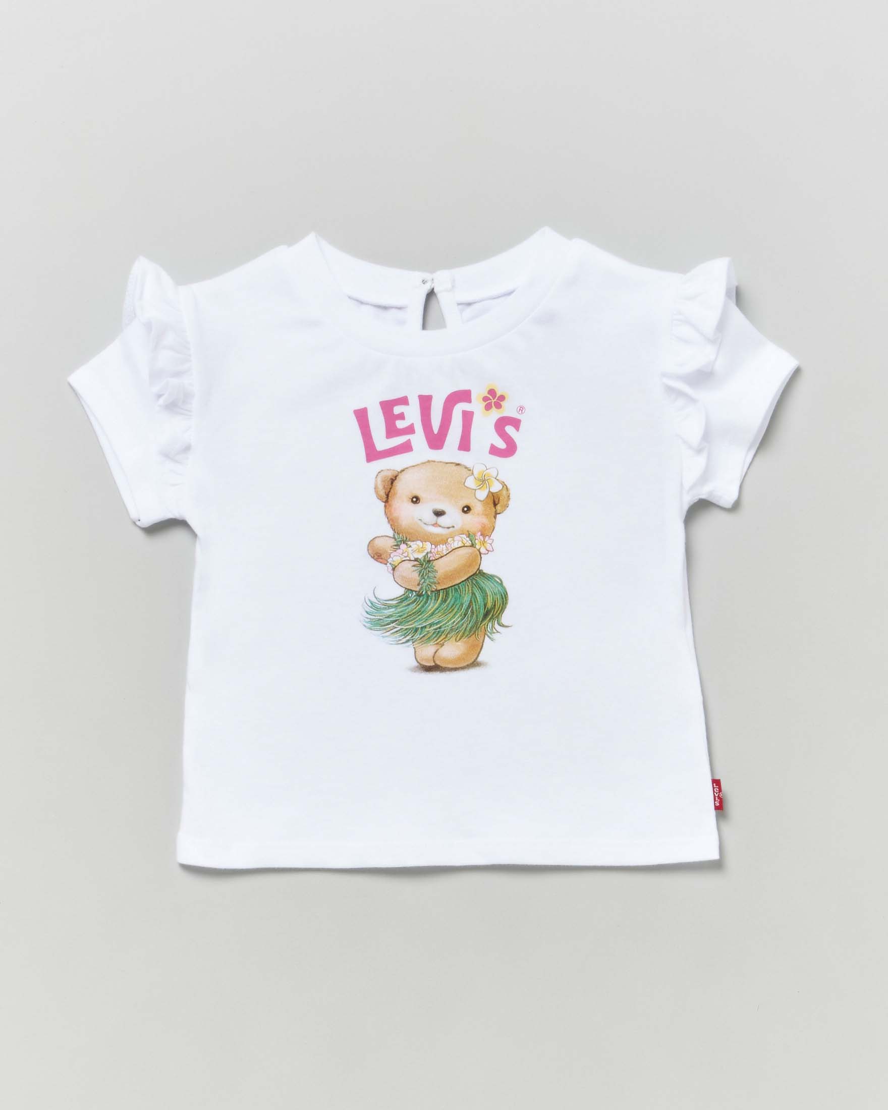 T-shirt in puro cotone a maniche corte, girocollo con collo elasticizzato, chiusura a goccia tramite bottoncino sul retro, rouches in tono ricamate al giromanica e stampa orsetta Hawaiana applicata sul davanti.