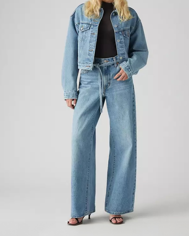 Jeans oversize wide leg a vita media lavaggio chiaro super stone washed in puro cotone con cinturina in coordinato