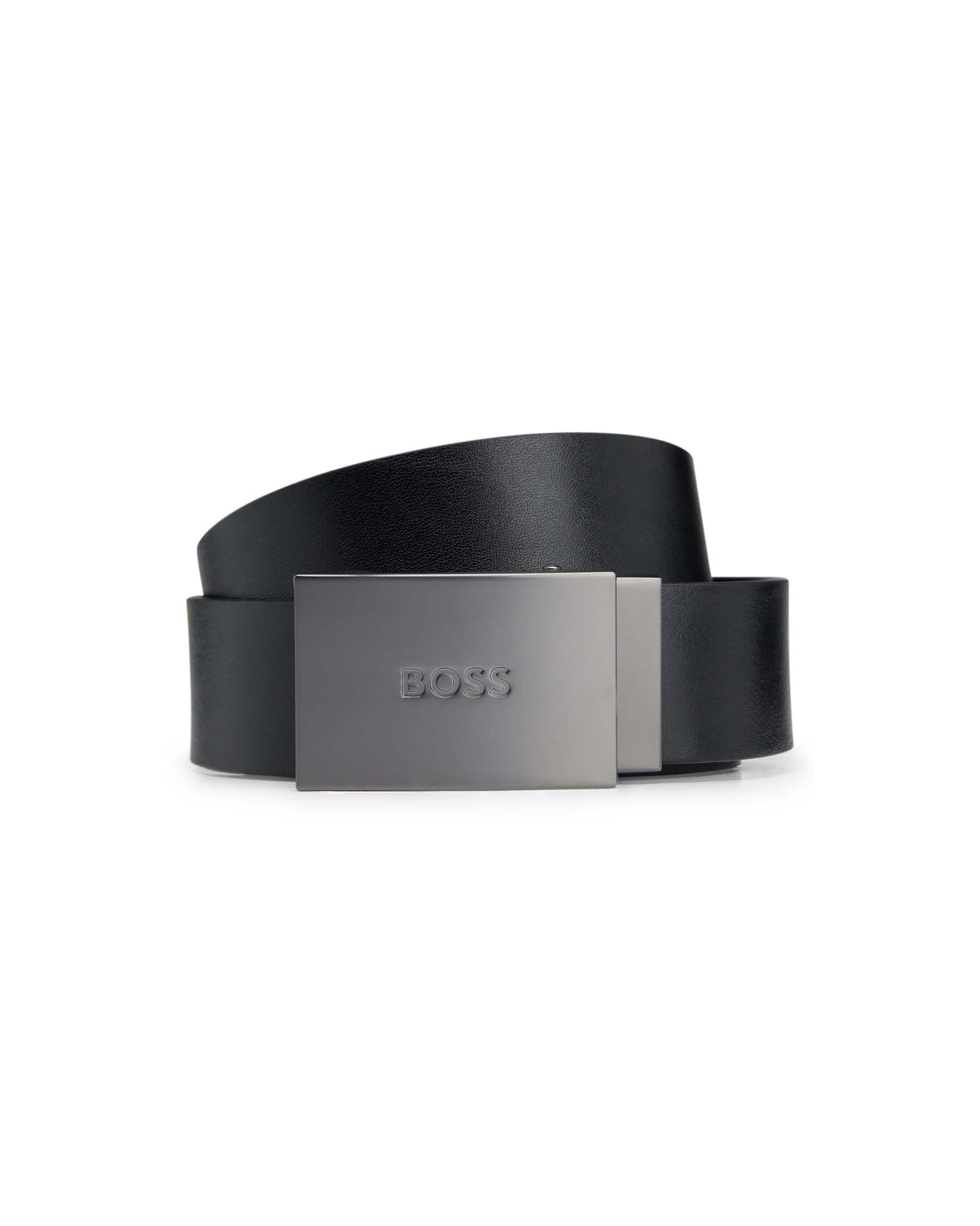Cintura Boss nera in pelle con fibbia a placca in metallo opaco