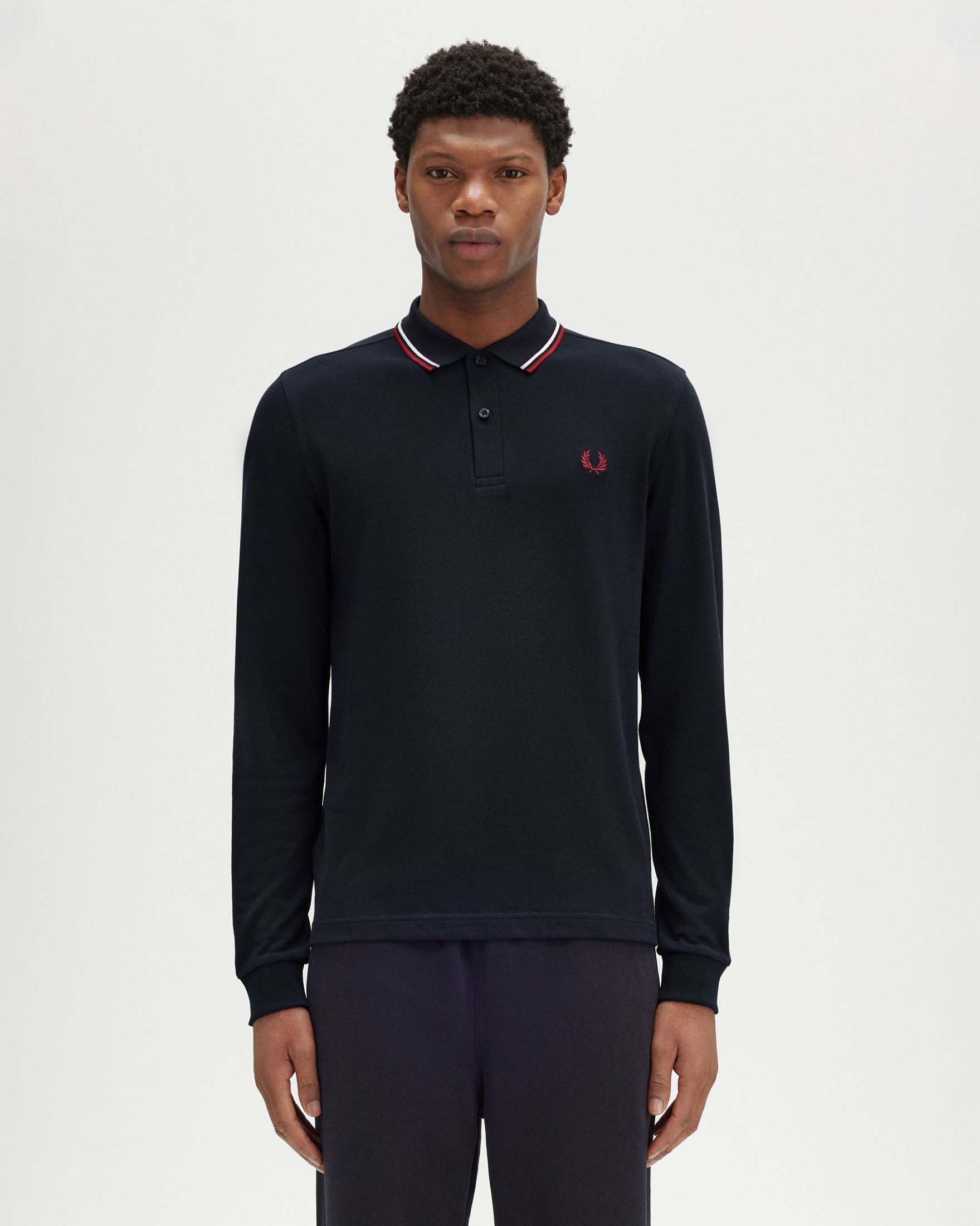 Polo manica lunga Fred Perry blu con bordino bianco e rosso