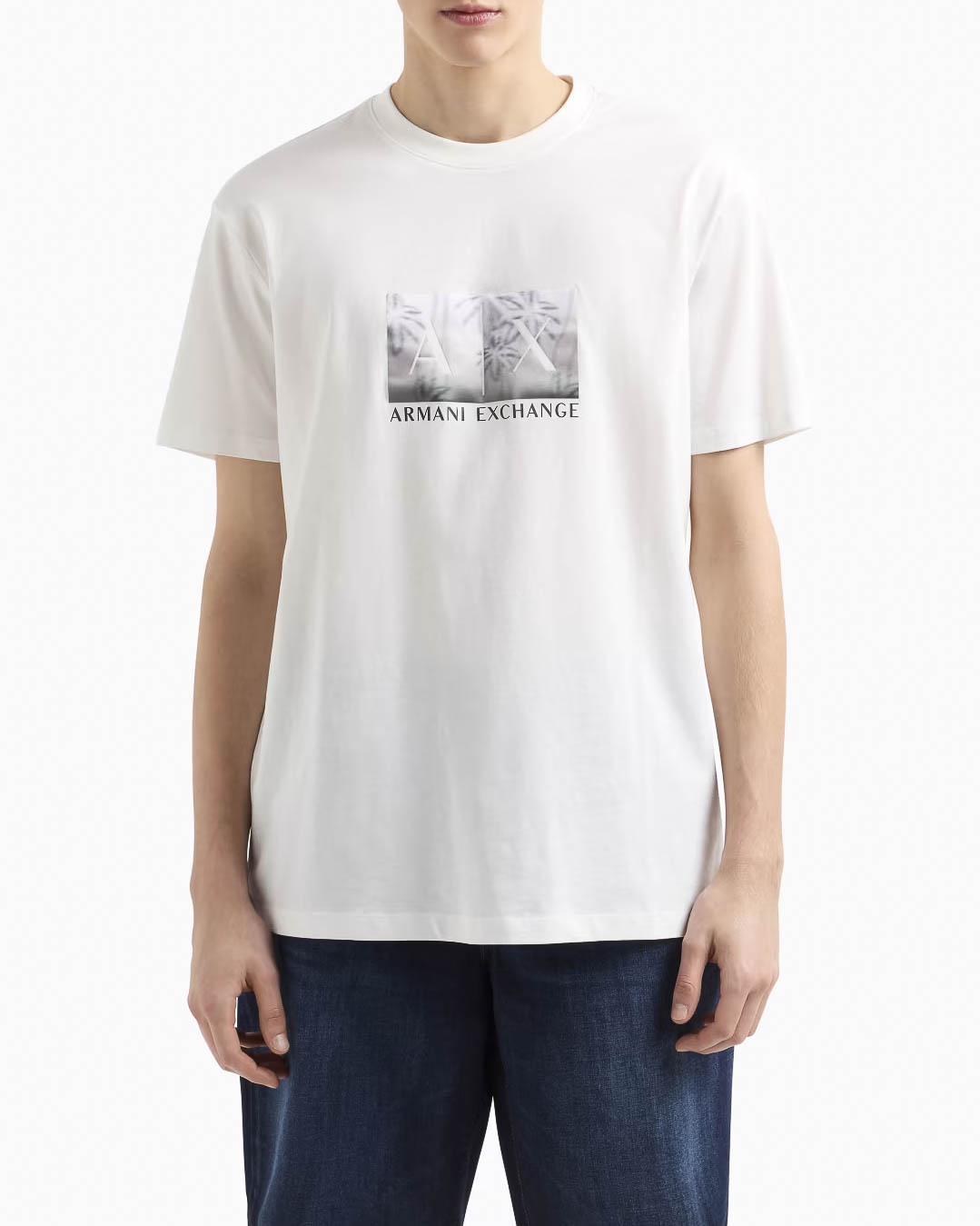 T-shirt bianca mezza manica con stampa tab logo in grafica palme davanti