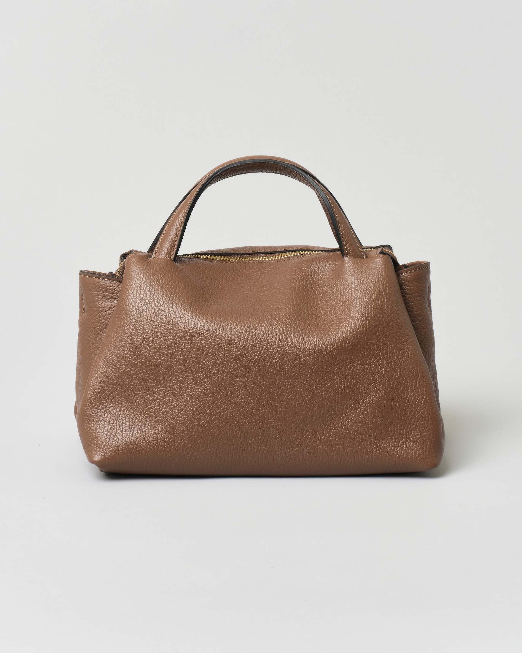 Borsa a mano in pelle morbida effetto martellato dalla linea a trapezio con tracolla più lunga rimovibile con moschettoni laterai. Chiusura a cerniera e tasca interna a parete. Misure 17 x 24 x 15,5 cm.