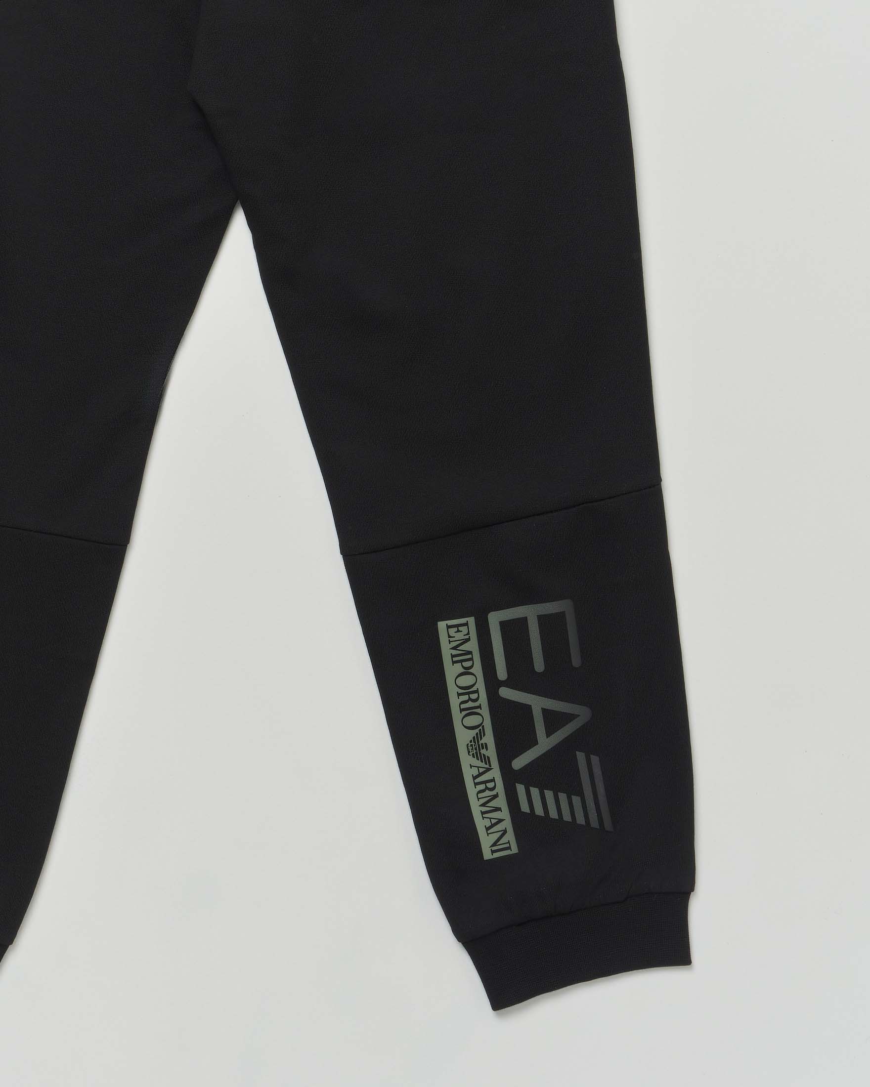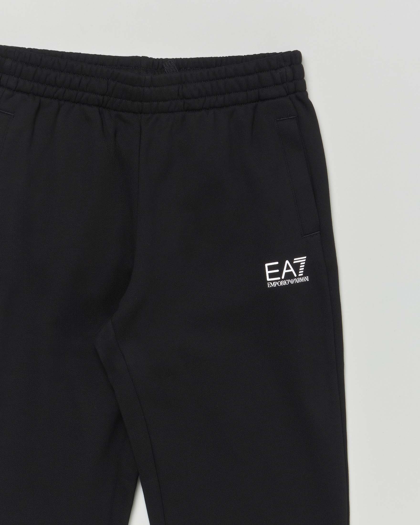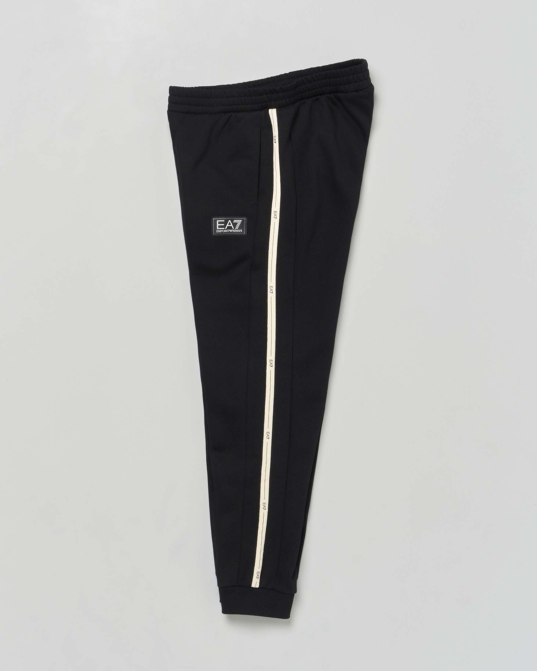 Pantalone in felpa di cotone con elastico inserito in vita regolato da coulisse nascosta, polsini alle caviglie, logo applicato sul lato sinistro anteriore, due tasche laterali a filetto.