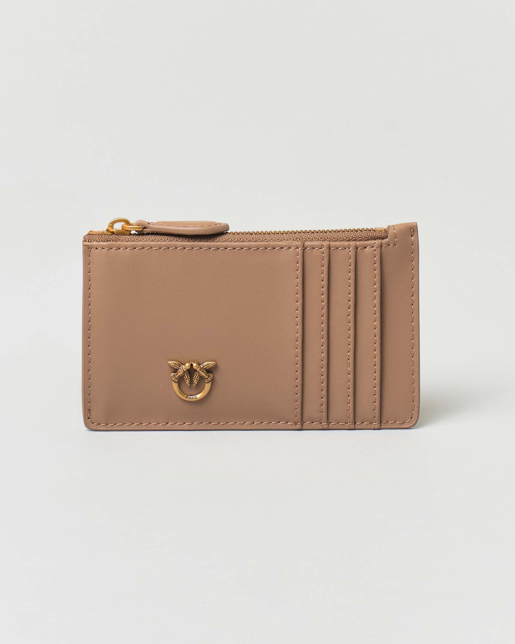 Porta carte di credito color cammello in pelle con fibbia Lover Birds dorata