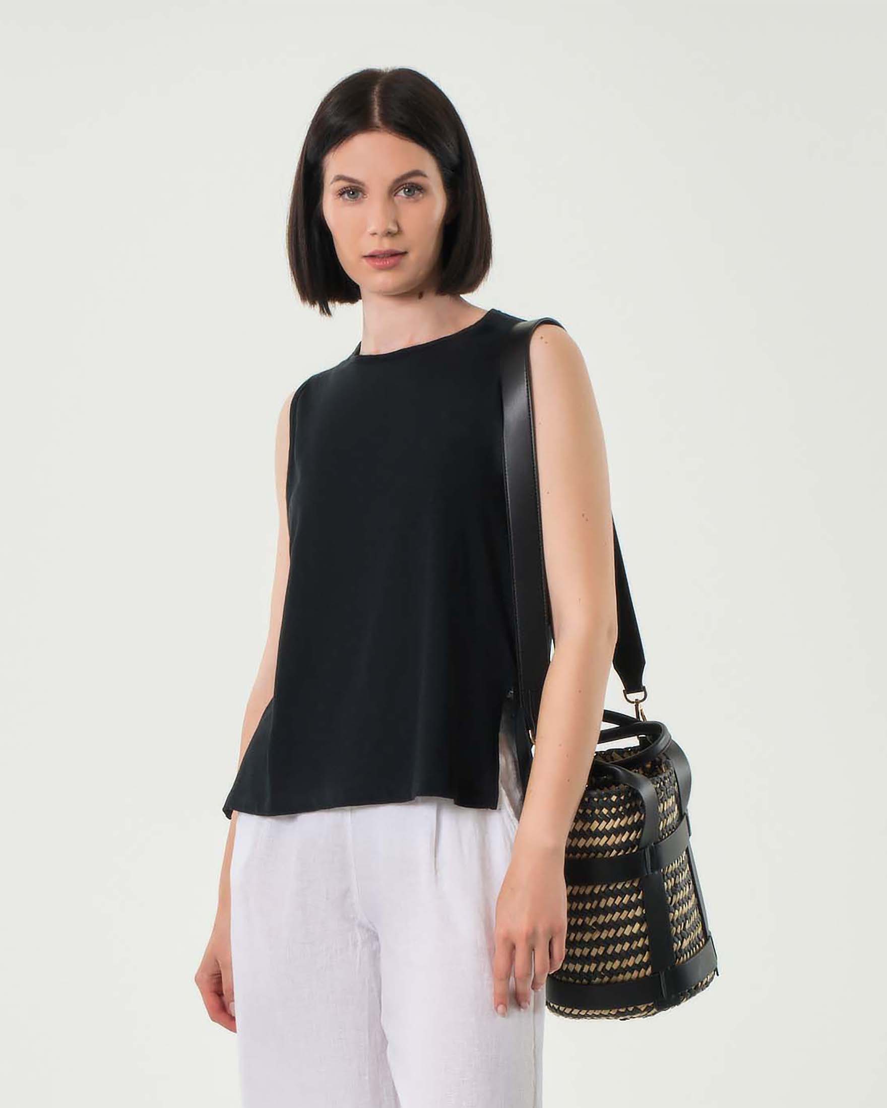 T-shirt nera Hlo! senza maniche in cotone e lino con spacchetti al fondo