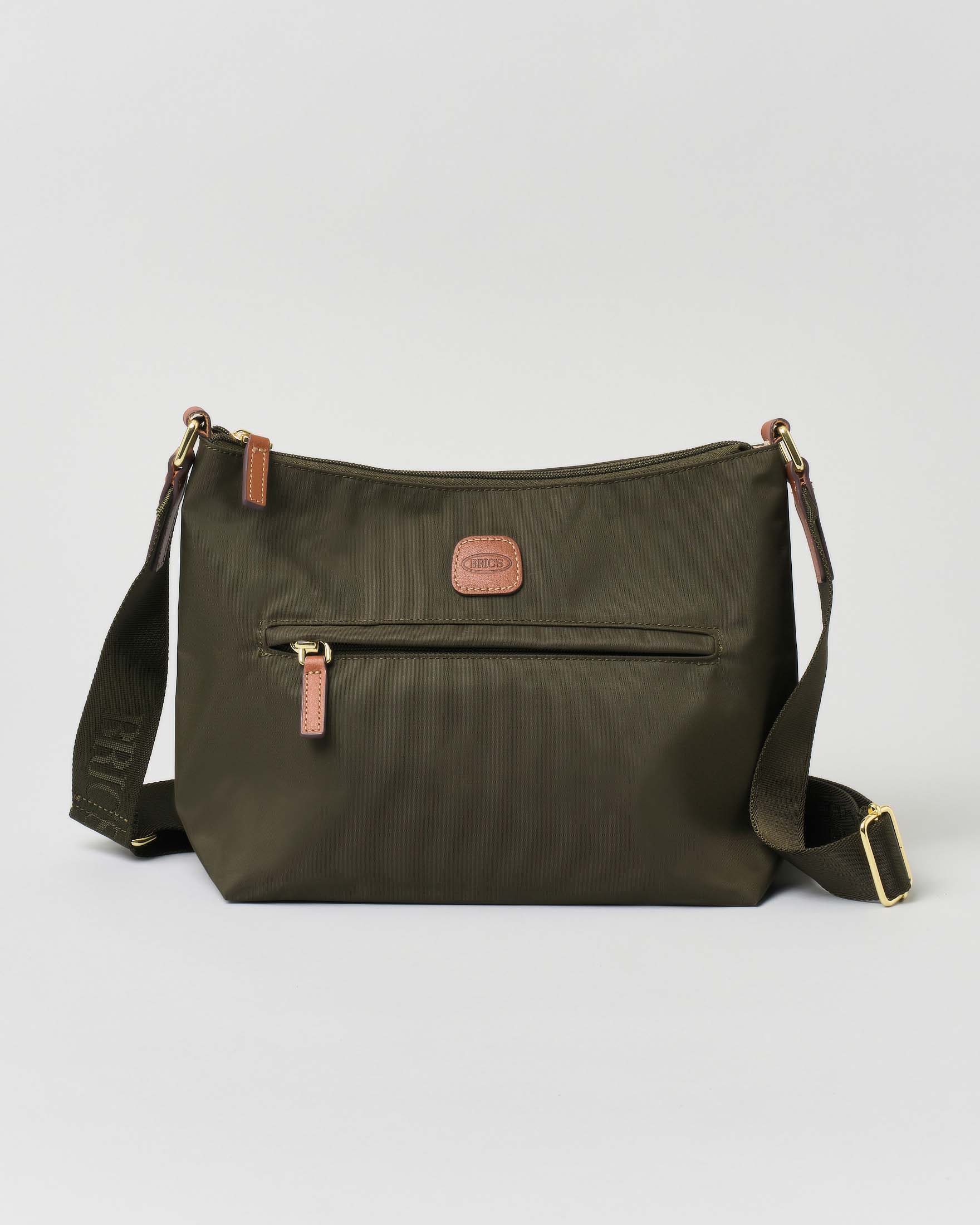 Borsa a tracolla verde oliva Bric's in nylon misura piccola in tessuto regolabile e dettagli in pelle color cuoio