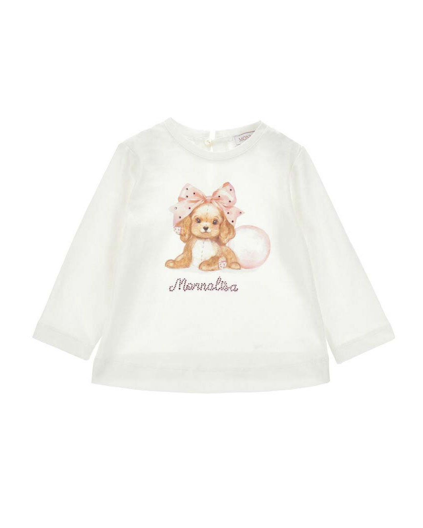 T-shirt manica lunga Monnalisa color avorio con stampa cagnolino e strass -50%