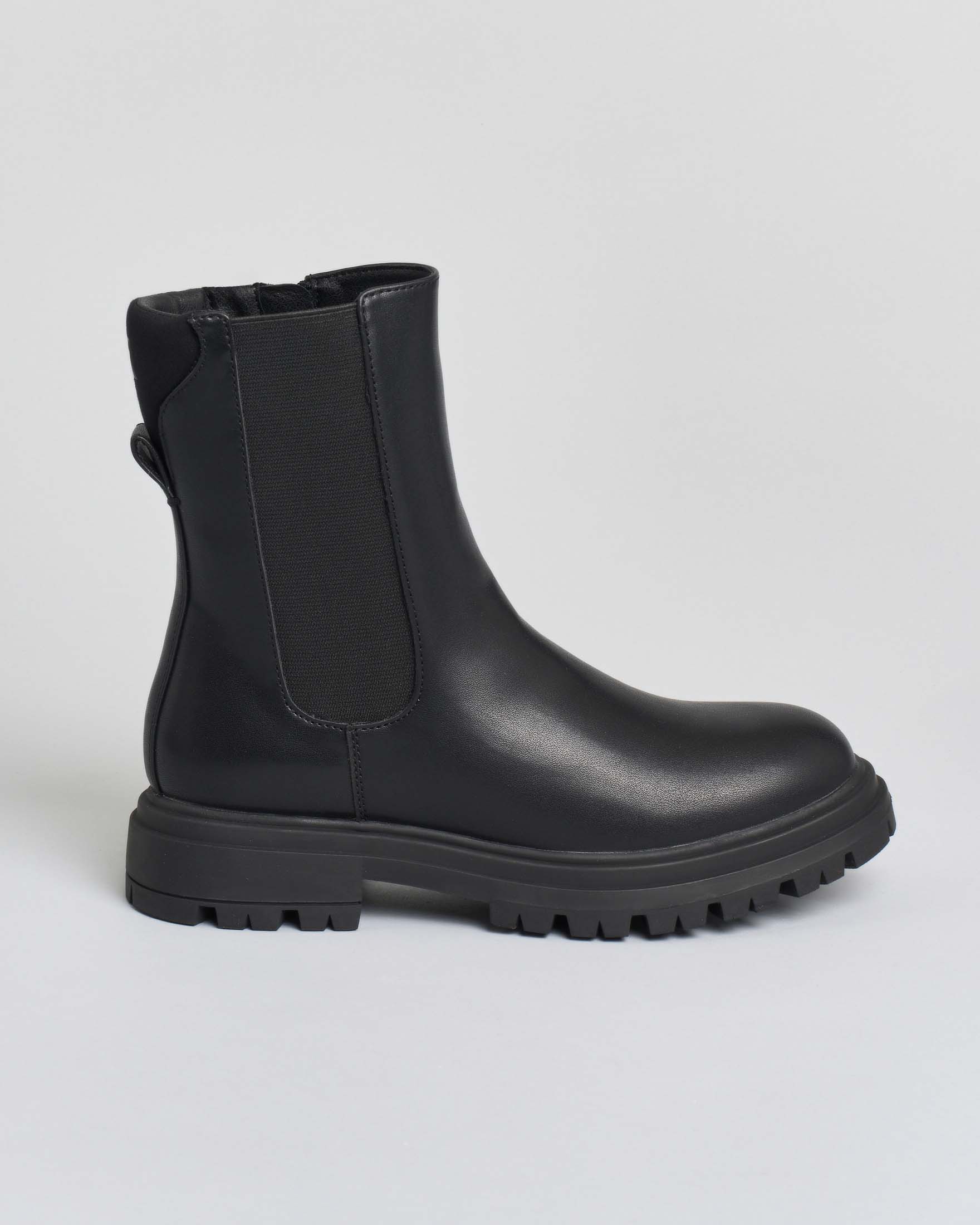 Stivaletto modello Chelsea in similpelle con elastico laterale, suola gommata effetto carrarmato, chiusura tramite cerniera sul lato interno e logo monogram sul retro in tono colore.
