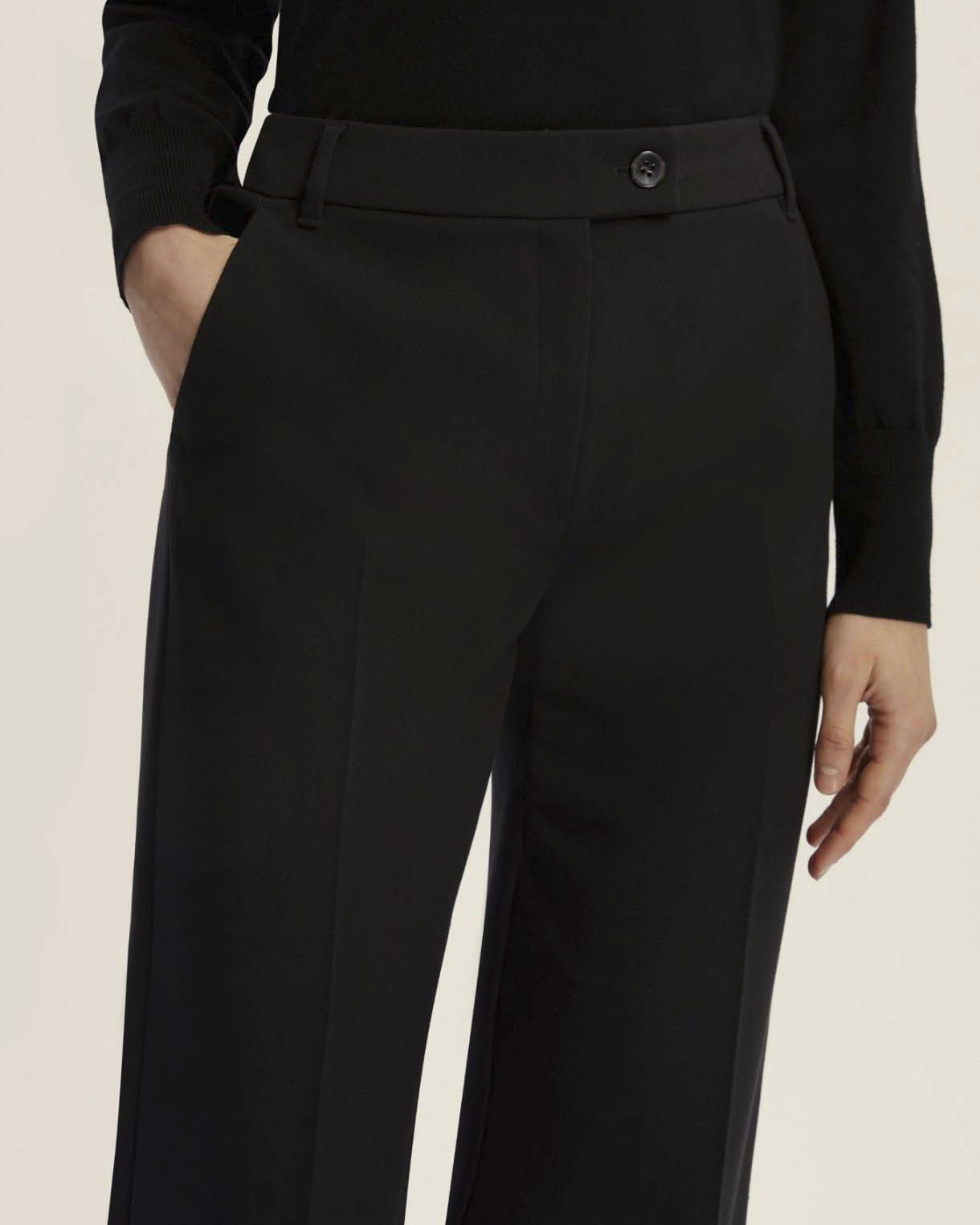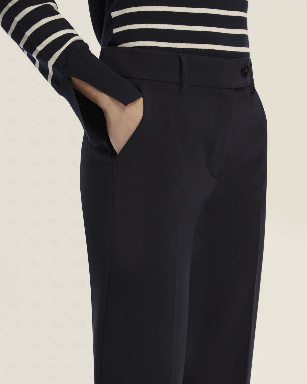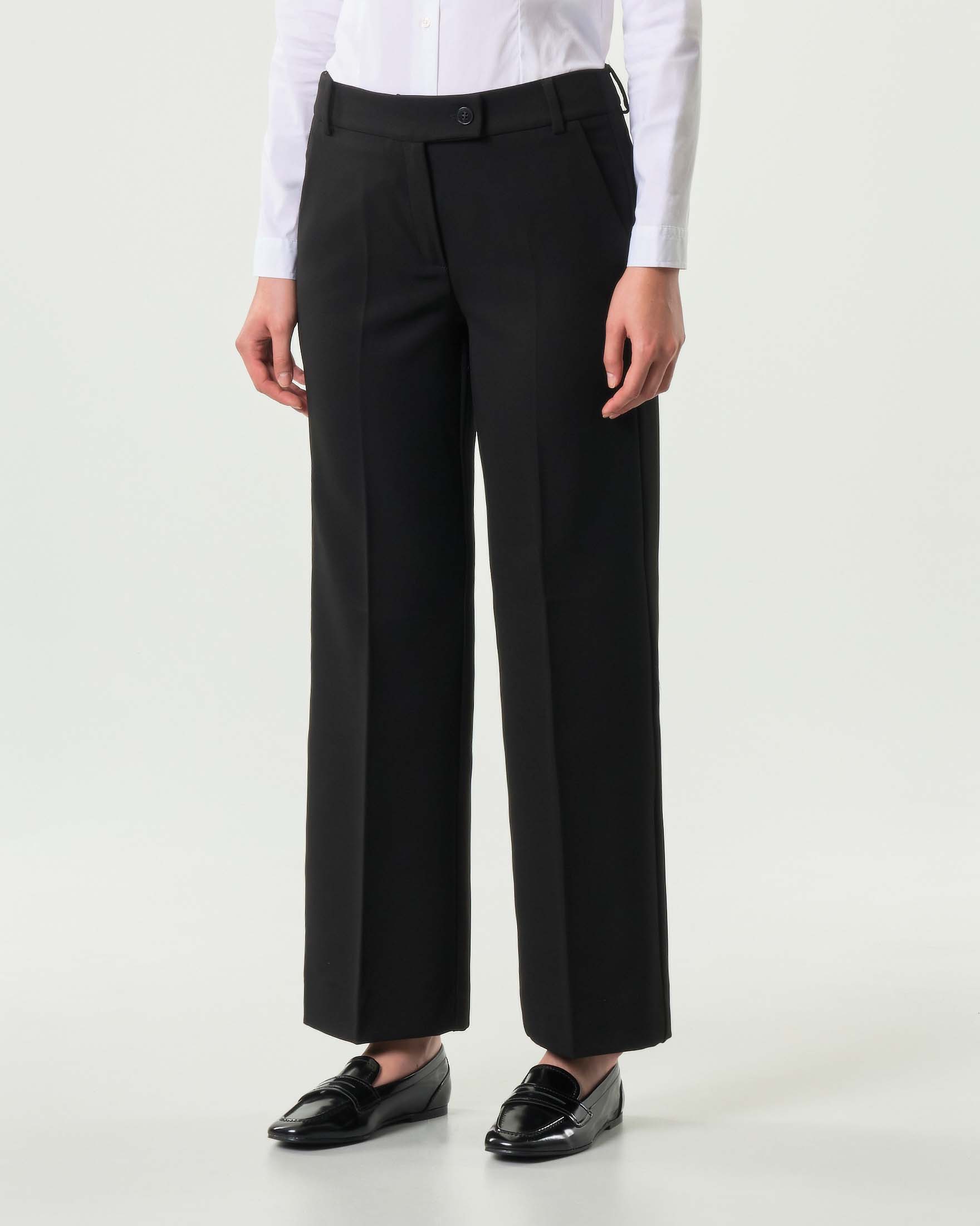 Pantaloni straigh lunghezza sopra la caviglia in gabardina stretch. Risvolto alto al fondo cucito. Chiusura a cerniera coperta e bottone. Passanti in vita e tasche laterali alla francese.