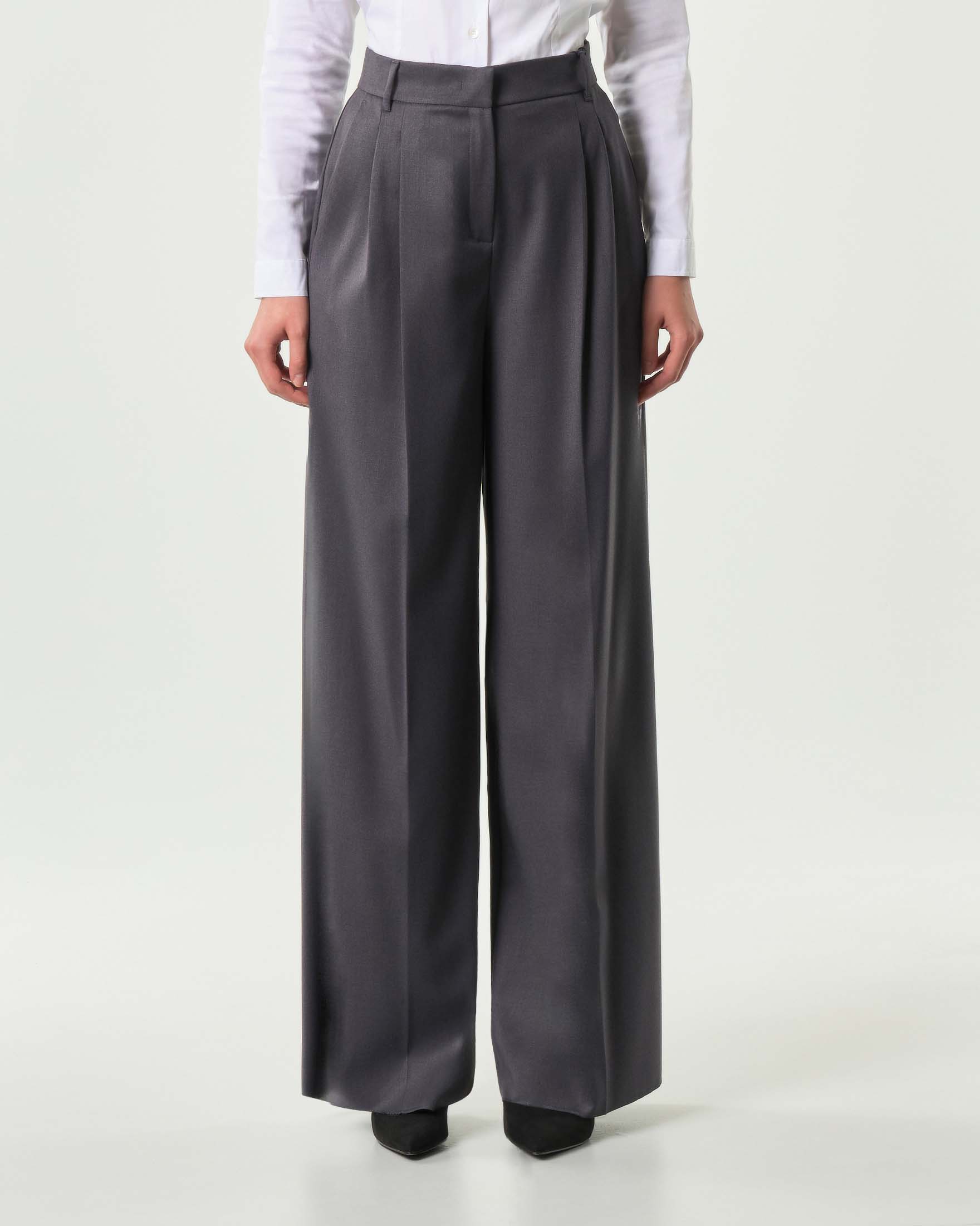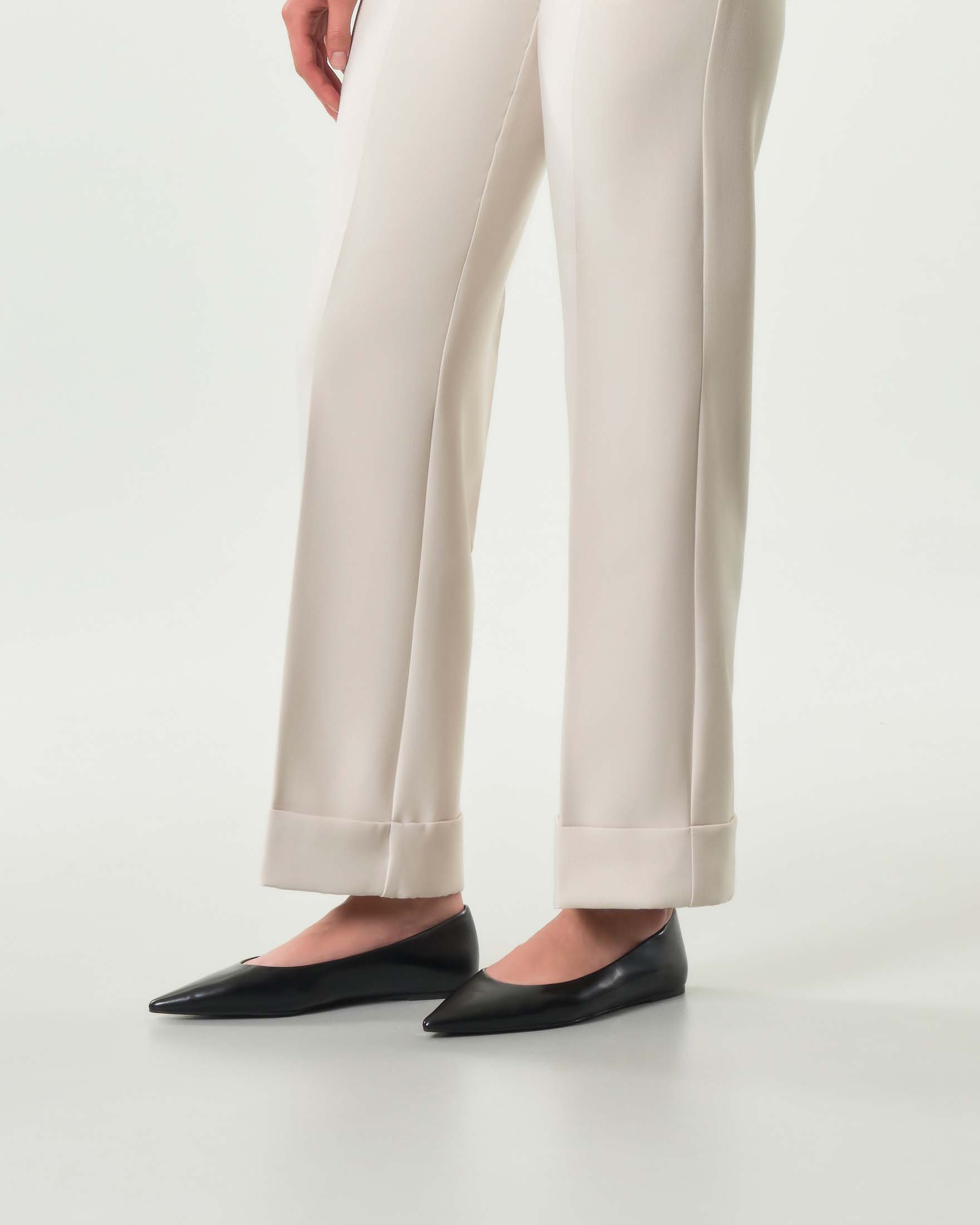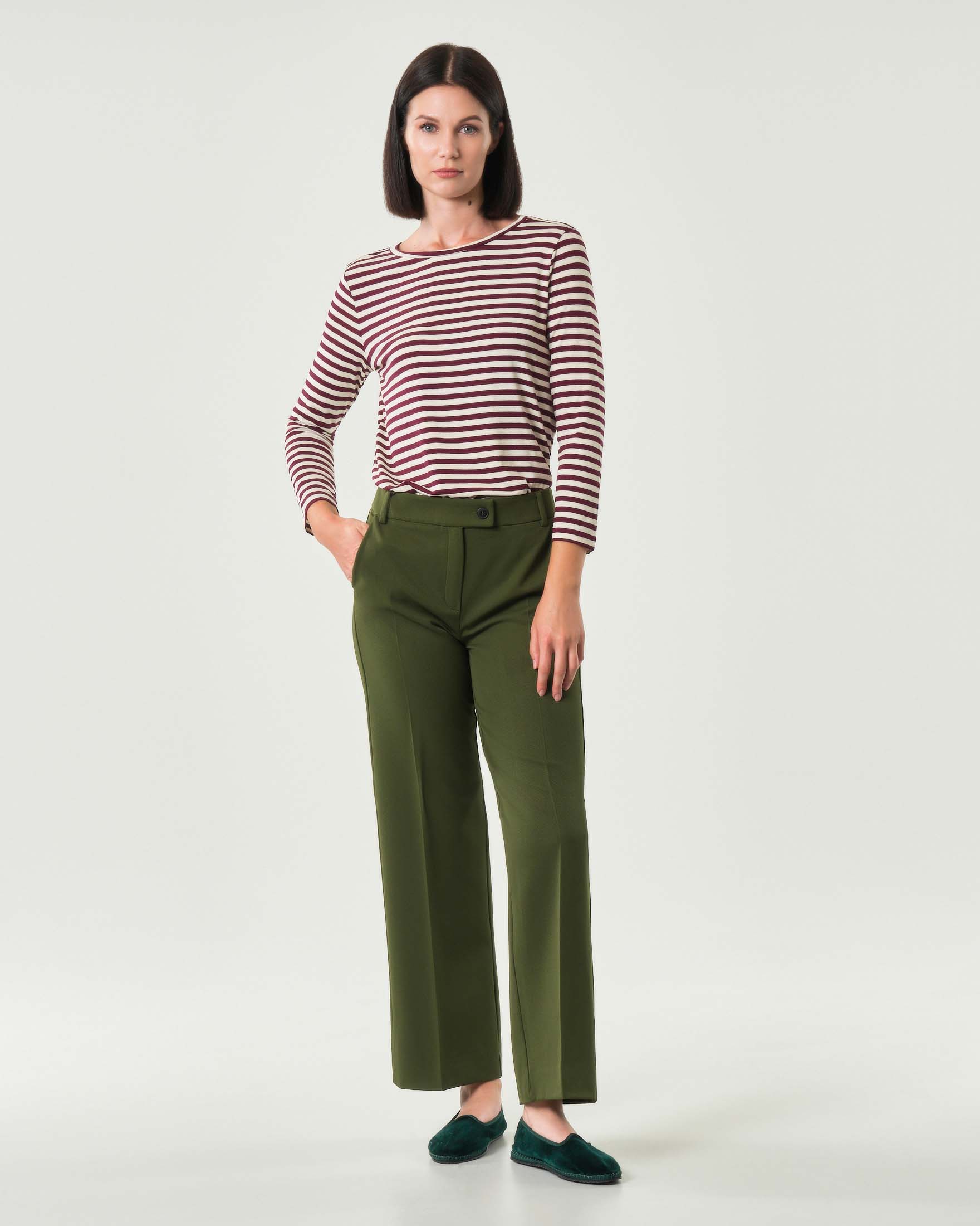 Pantaloni straigh lunghezza sopra la caviglia in gabardina stretch. Risvolto alto al fondo cucito. Chiusura a cerniera coperta e bottone. Passanti in vita e tasche laterali alla francese.