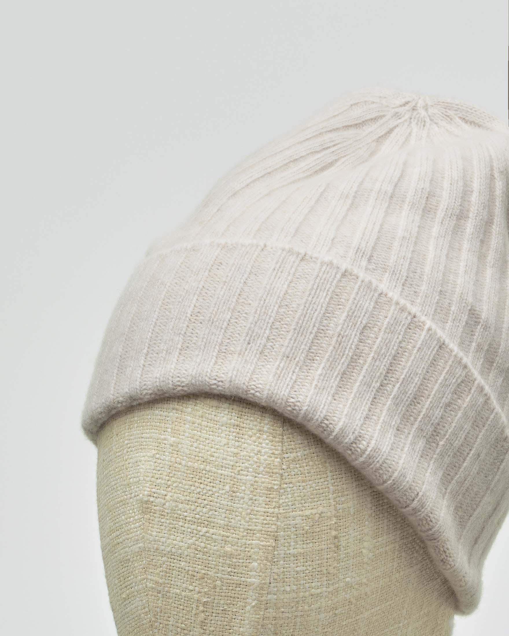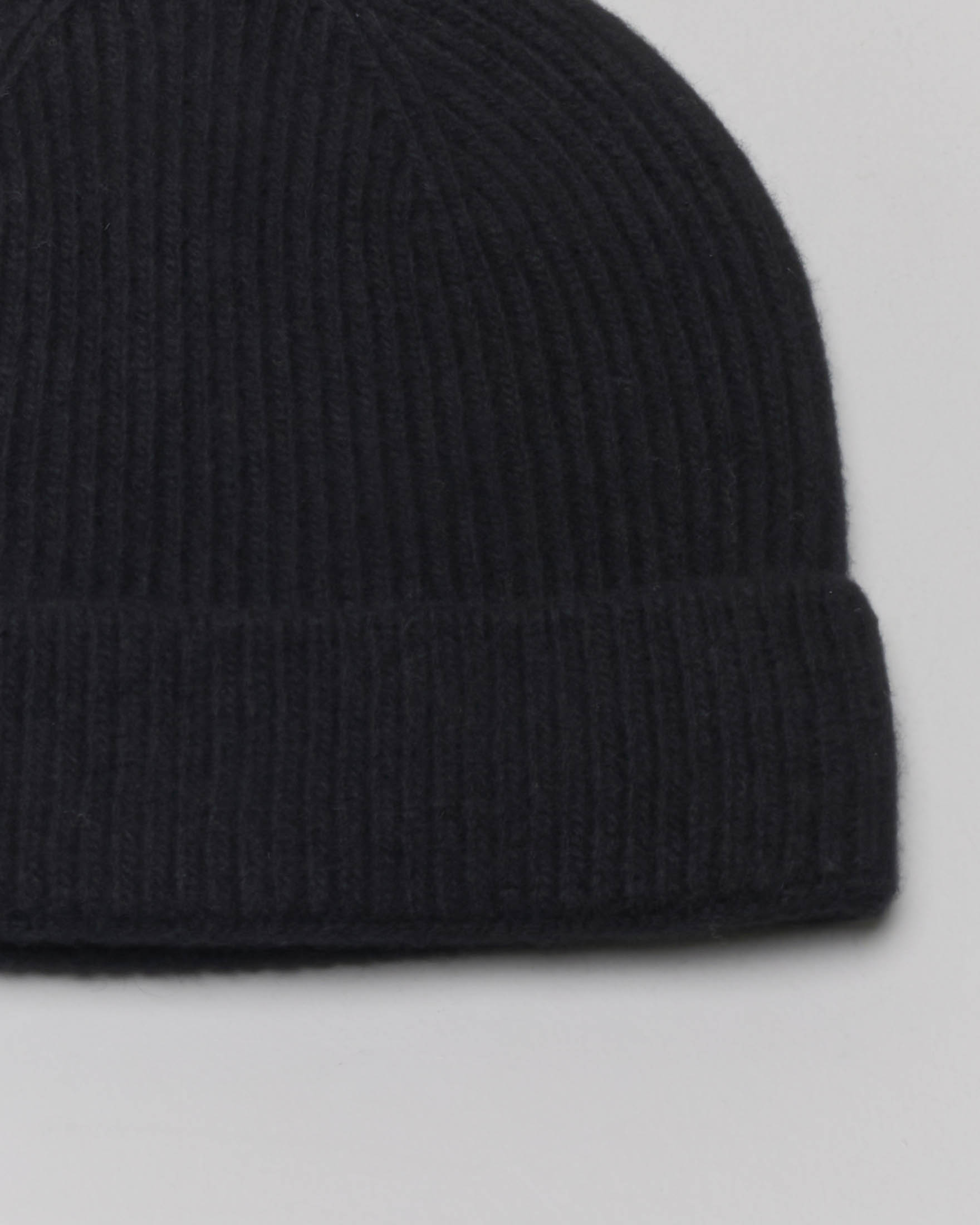 Berretto in misto lana merino e cachemire lavorato a coste con risvolto.