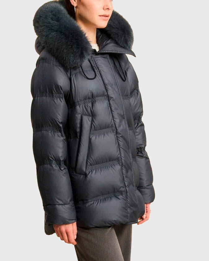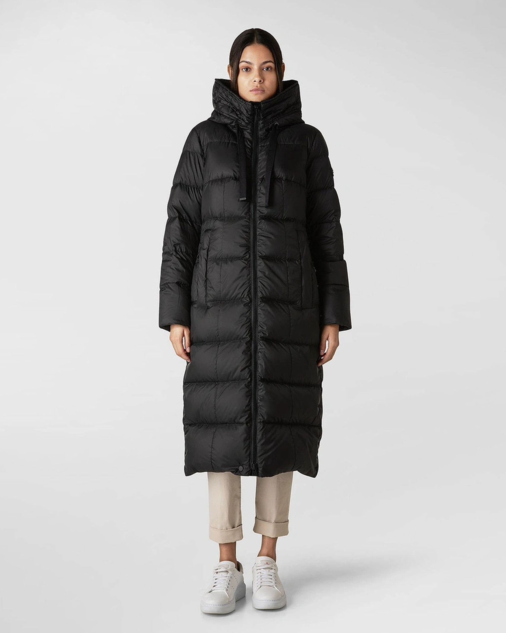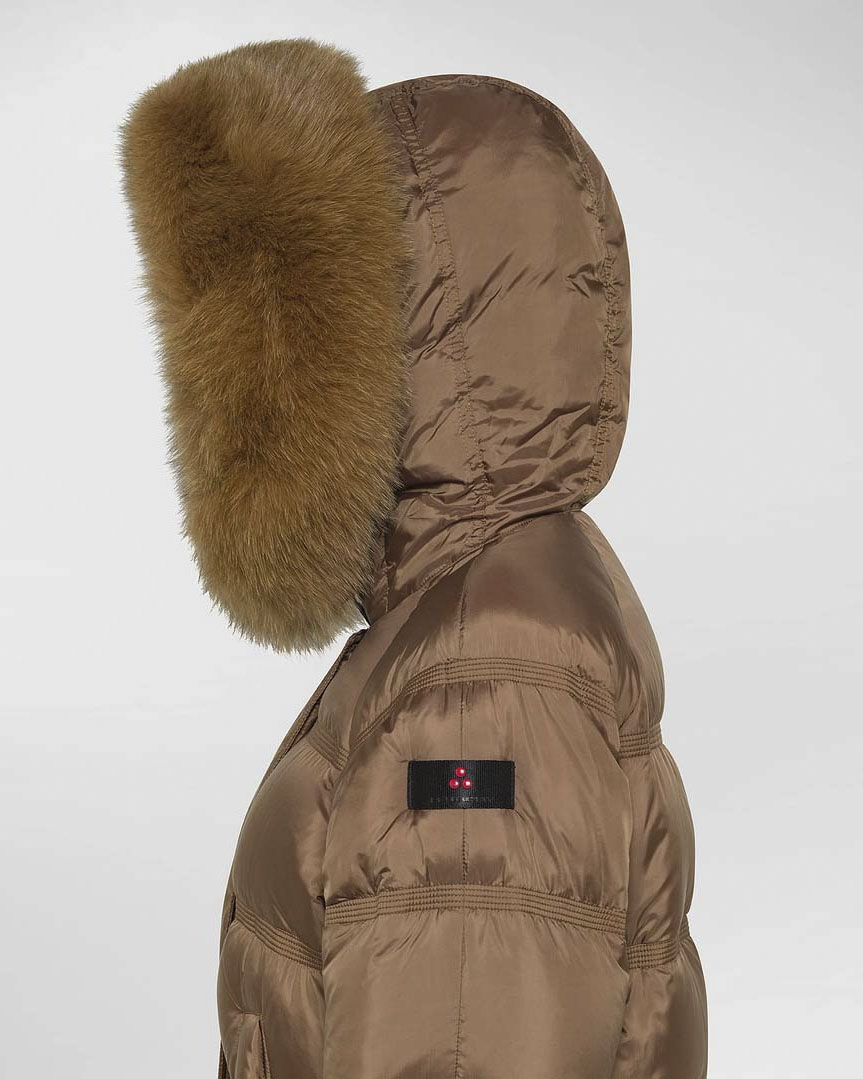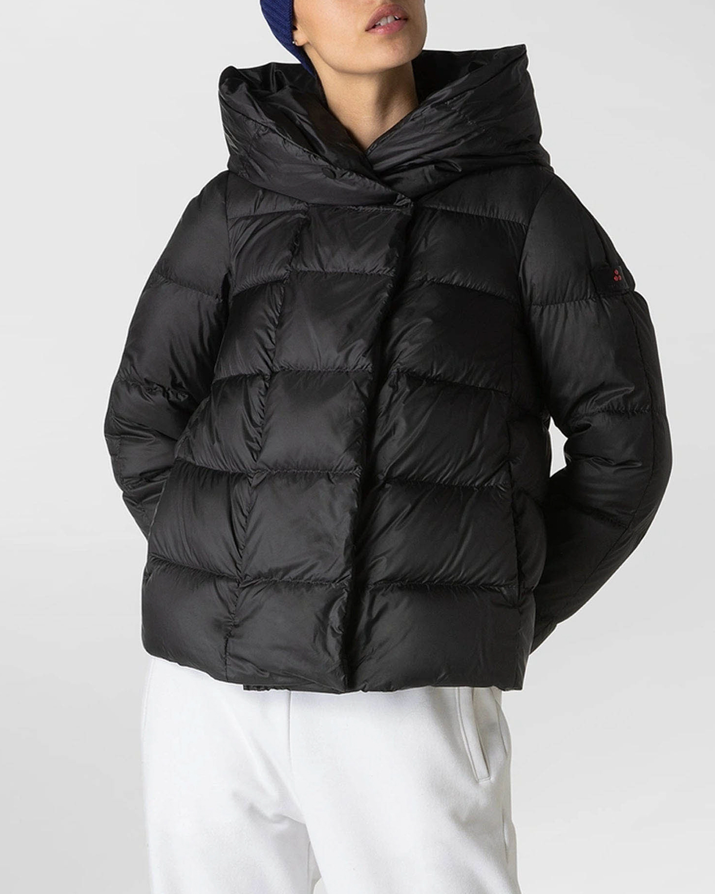 Piumino in tessuto superleggero semi opaco con trapuntatura orizzontale e imbottitura in piuma. Chiusura centrale con bottoni a pressione coperti da patta. Tasche laterali inserite in cucitura. Ampio collo alto sciallato con bottone automatico alla base e cappuccio fisso. Materiale riciclato certificato GRS (Global Recycle Standard). Temperature comprese tra i 10°C e i -5°C.