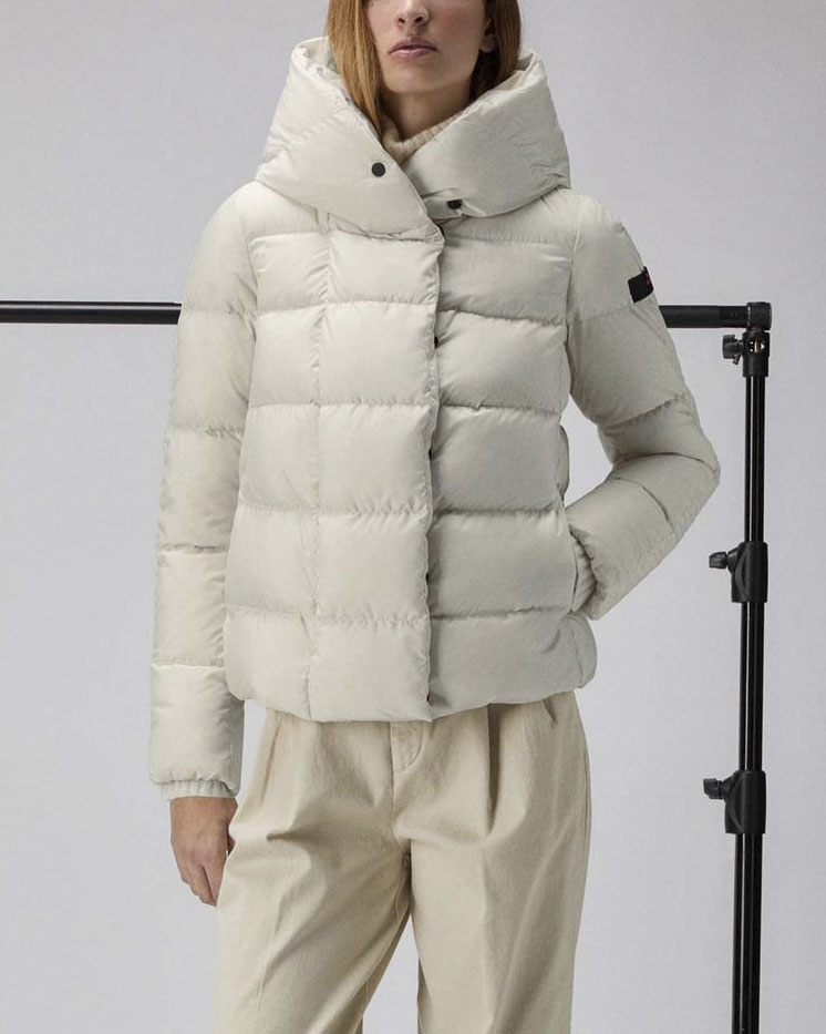 Piumino color latte Peuterey imbottito in piuma dalla linea boxy con scollo sciallato e cappuccio