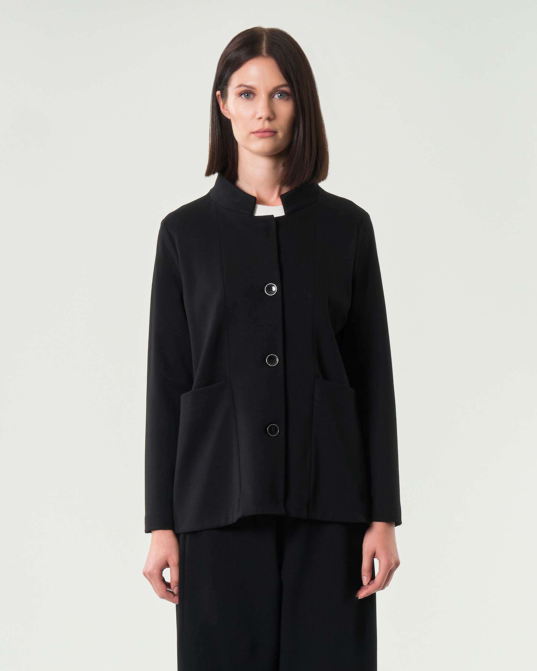 Giacca nera Jurerê in tricotina di misto viscosa con colletto in piedi e tasche laterali applicate