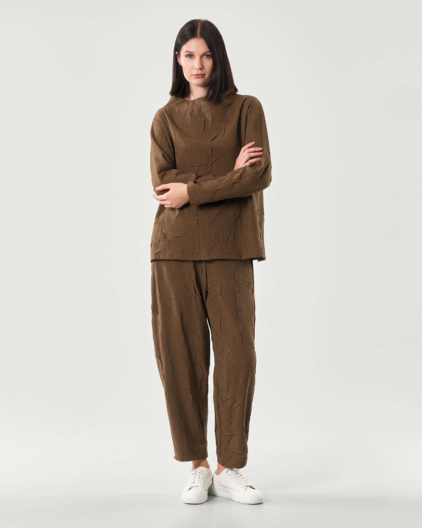 Blusa color noce Jurerê in misto ramiè effetto froissè con collo in piedi a cratere
