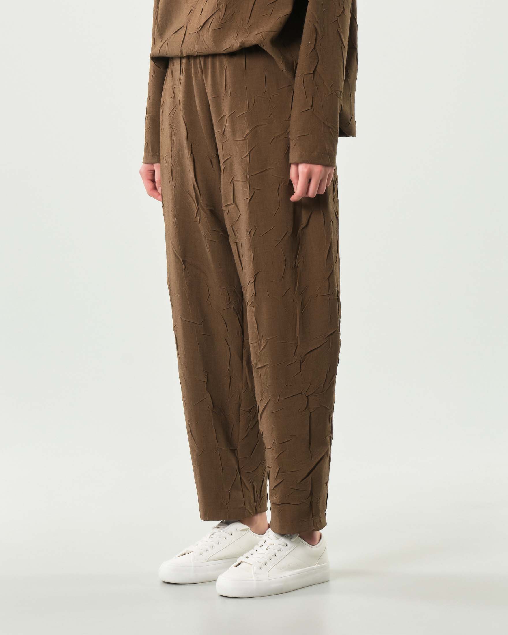 Pantaloni color noce a pallocino Jurerê in misto ramiè effetto froissè con elastico inserito in vita